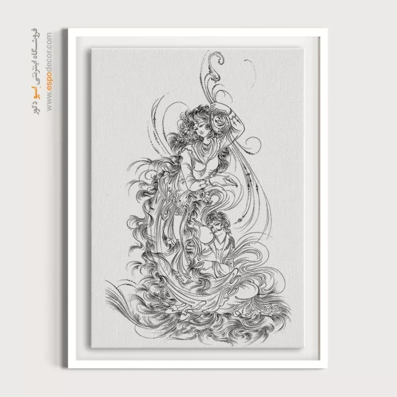 تابلو مینیاتور خطی با طراحی سیاه و سفید و سبک سنتی ایرانی، انتخابی خاص برای دکوراسیون کلاسیک و مینیمال است. این تابلو با قاب مینیمال، جلوه‌ای آرامش‌بخش به دیوارهای خانه یا محل کار شما می‌بخشد.
