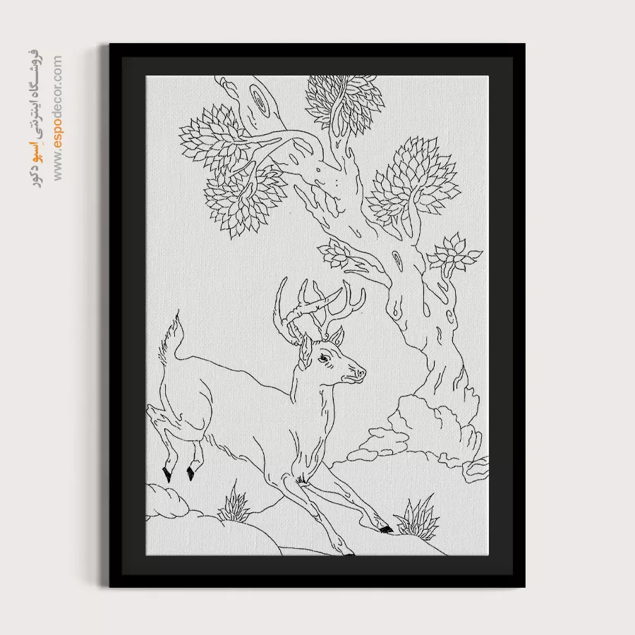تابلو مینیاتور خطی با طراحی سیاه و سفید و سبک سنتی ایرانی، انتخابی خاص برای دکوراسیون کلاسیک و مینیمال است. این تابلو با قاب مینیمال، جلوه‌ای آرامش‌بخش به دیوارهای خانه یا محل کار شما می‌بخشد.
