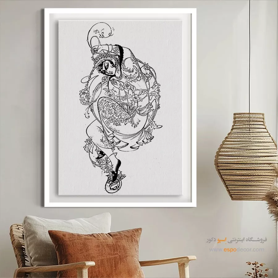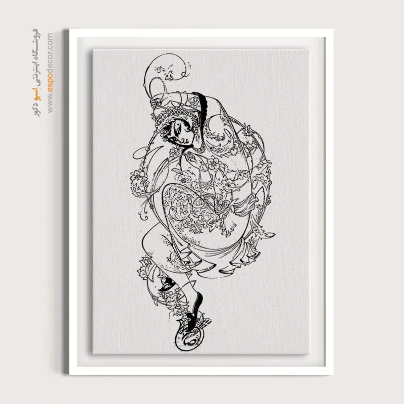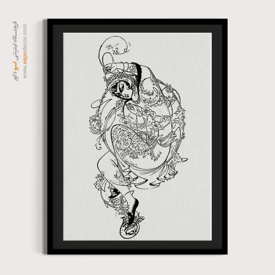 تابلو مینیاتور خطی با طراحی سیاه و سفید و سبک سنتی ایرانی، انتخابی خاص برای دکوراسیون کلاسیک و مینیمال است. این تابلو با قاب مینیمال، جلوه‌ای آرامش‌بخش به دیوارهای خانه یا محل کار شما می‌بخشد.