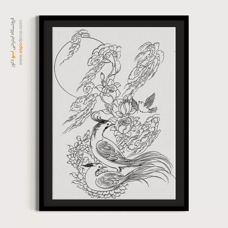 تابلو مینیاتور خطی با طراحی سیاه و سفید و سبک سنتی ایرانی، انتخابی خاص برای دکوراسیون کلاسیک و مینیمال است. این تابلو با قاب مینیمال، جلوه‌ای آرامش‌بخش به دیوارهای خانه یا محل کار شما می‌بخشد.