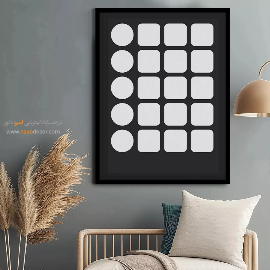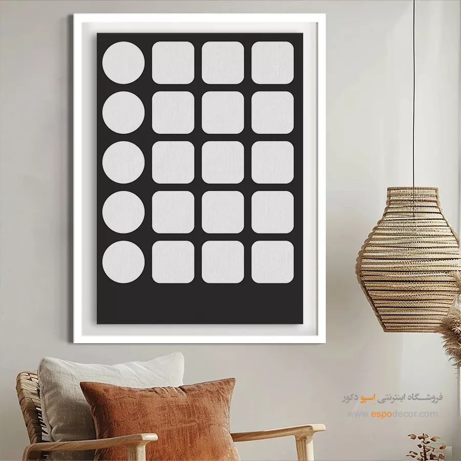 سبک مینیمال: تمرکز بر سادگی است. تابلوهای مینیمال آرت با خطوط ساده، اشکال هندسی و پالت رنگی خنثی (مانند سیاه، سفید، خاکستری یا بژ) ایده‌آل هستند. این تابلوها اغلب بدون قاب یا با کلاف ساده نصب می‌شوند تا تأکید بر مفهوم و فضای خالی باشد.