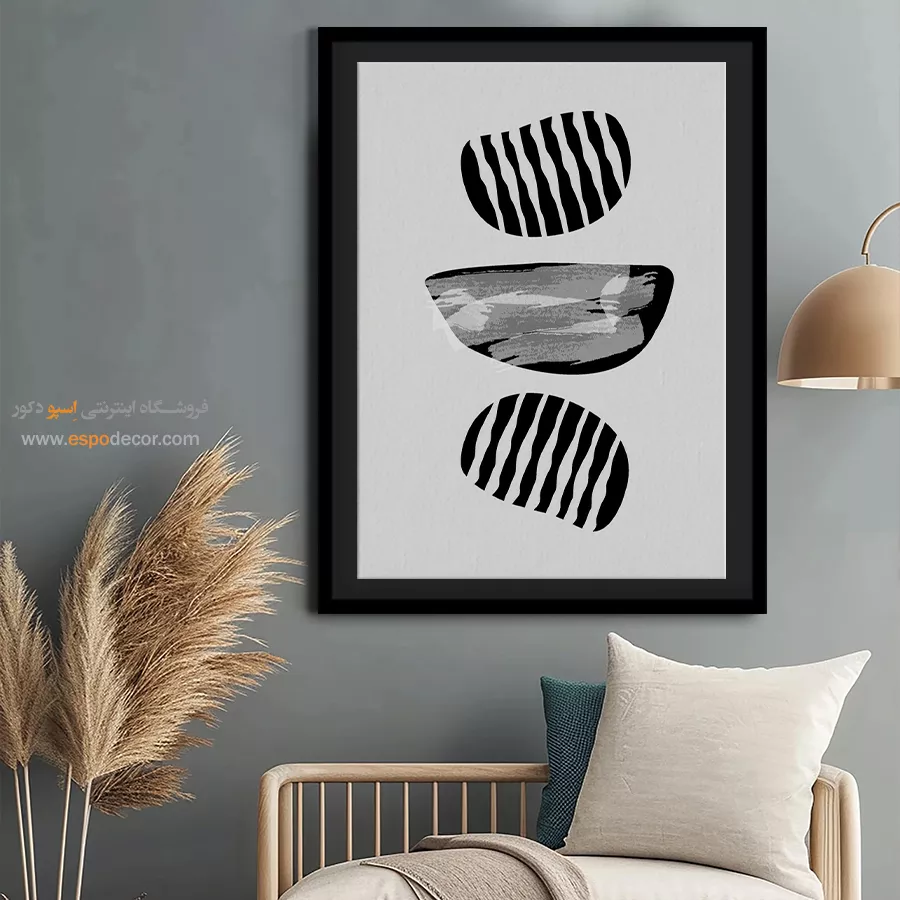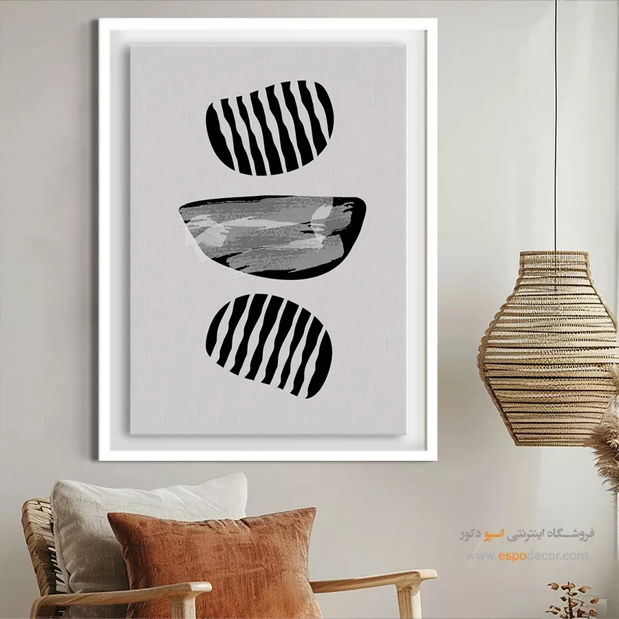 سبک مینیمال: تمرکز بر سادگی است. تابلوهای مینیمال آرت با خطوط ساده، اشکال هندسی و پالت رنگی خنثی (مانند سیاه، سفید، خاکستری یا بژ) ایدهآل هستند. این تابلوها اغلب بدون قاب یا با کلاف ساده نصب میشوند تا تأکید بر مفهوم و فضای خالی باشد.