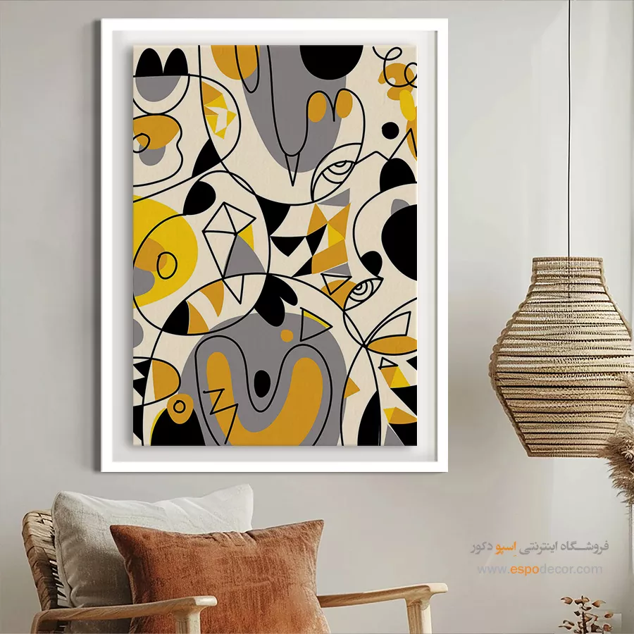 - استفاده از تابلویی با رنگ خنثی در پسزمینه: رنگهای سفید، خاکستری یا بژ، در حالی که رنگ اصلی دیوار یا رنگهای جزئی مبلمان و اکسسوریها در طرح آن تکرار شده باشد. این روش تعادل را در فضا تضمین کرده و از شلوغی بصری جلوگیری میکند.