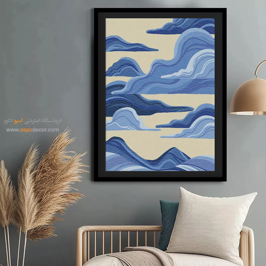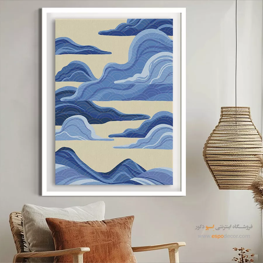 - انتخاب سایههای مختلف از رنگ دیوار: مانند تابلو آبی تیره روی دیوار آبی روشن، که حس آرامش و یکپارچگی در فضا ایجاد میکند.