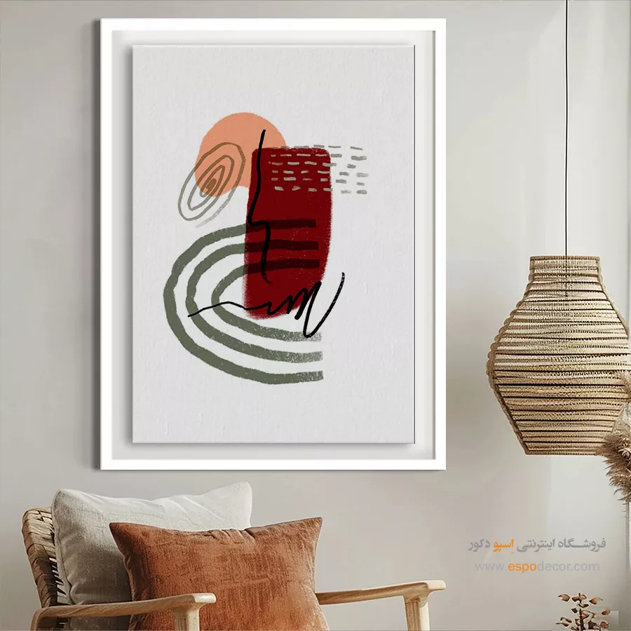 - استفاده از تابلویی با رنگ خنثی در پسزمینه: رنگهای سفید، خاکستری یا بژ، در حالی که رنگ اصلی دیوار یا رنگهای جزئی مبلمان و اکسسوریها در طرح آن تکرار شده باشد. این روش تعادل را در فضا تضمین کرده و از شلوغی بصری جلوگیری میکند.