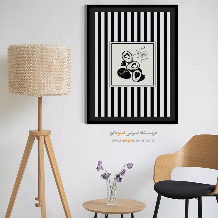 سبک مینیمال: تمرکز بر سادگی است. تابلوهای مینیمال آرت با خطوط ساده، اشکال هندسی و پالت رنگی خنثی (مانند سیاه، سفید، خاکستری یا بژ) ایده‌آل هستند. این تابلوها اغلب بدون قاب یا با کلاف ساده نصب می‌شوند تا تأکید بر مفهوم و فضای خالی باشد.