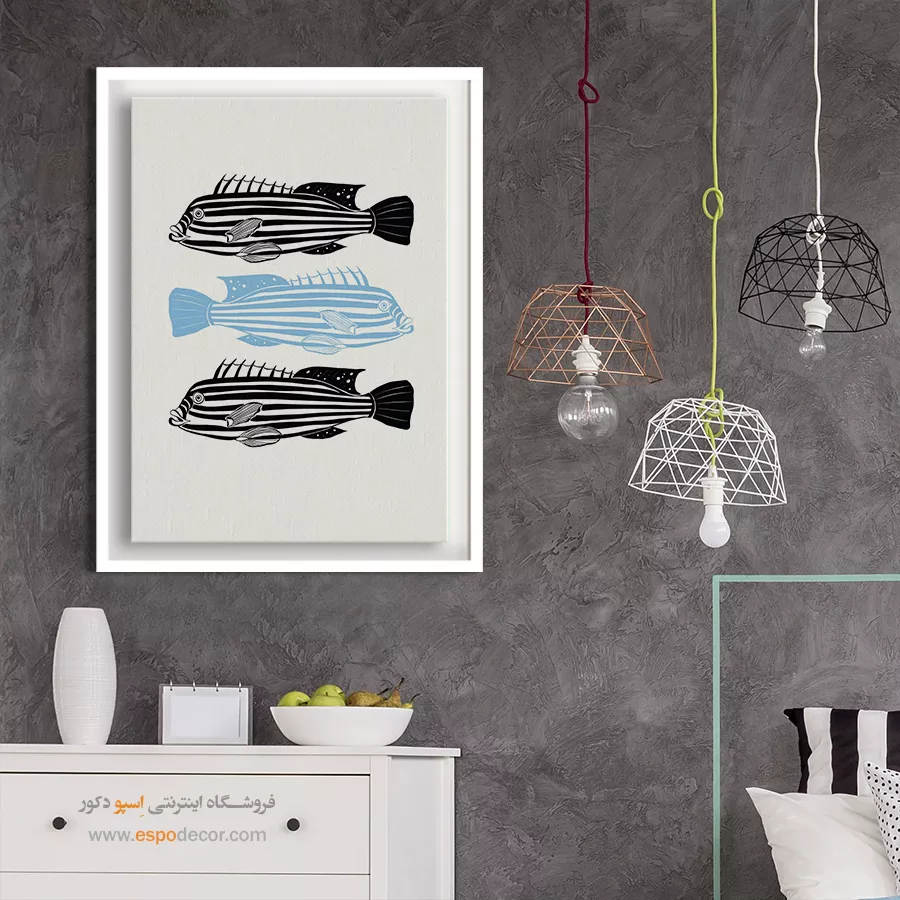 همچنین، استفاده از تابلوهای چندتکه با ابعاد کوچک تا متوسط یا یک تابلوی بزرگ با طرح عمودی (برای بلندتر نشان دادن سقف)، می‌تواند نقطه کانونی جذابی ایجاد کرده و کمبود نور را جبران نماید.