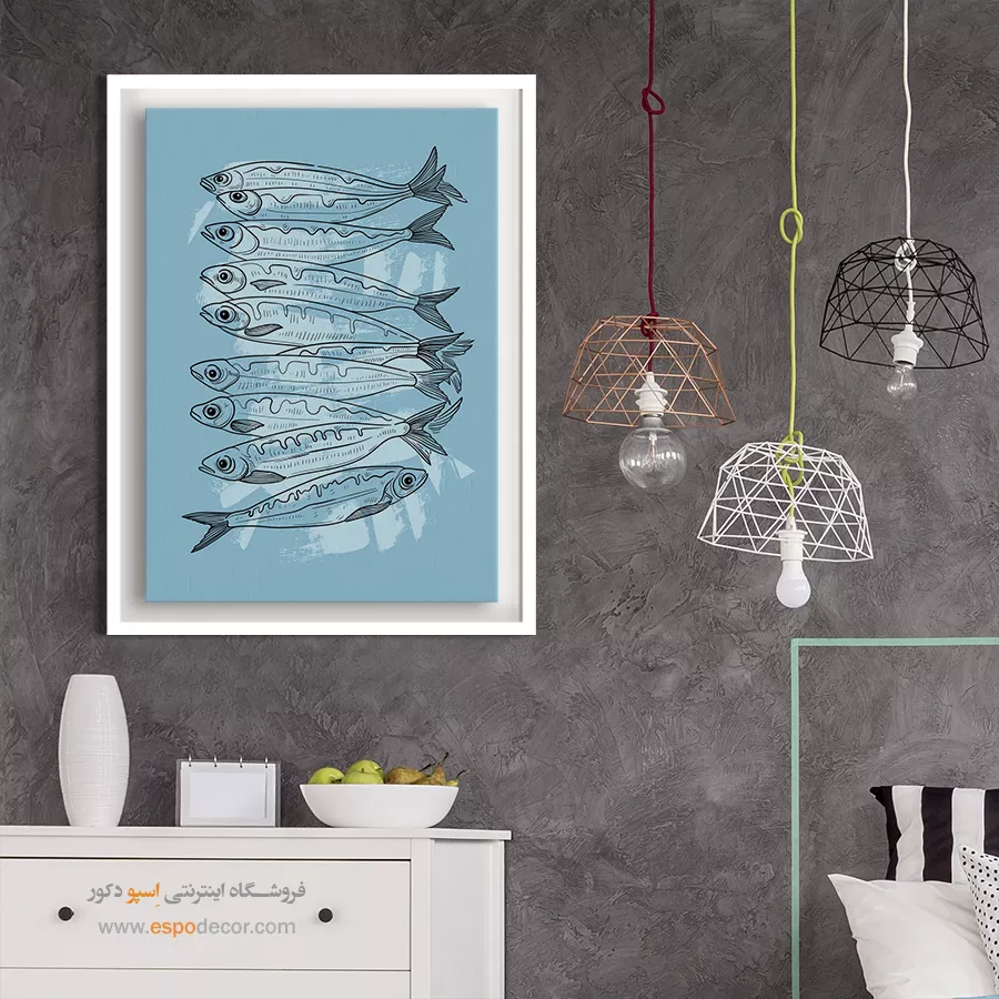 همچنین، استفاده از تابلوهای چندتکه با ابعاد کوچک تا متوسط یا یک تابلوی بزرگ با طرح عمودی (برای بلندتر نشان دادن سقف)، می‌تواند نقطه کانونی جذابی ایجاد کرده و کمبود نور را جبران نماید.