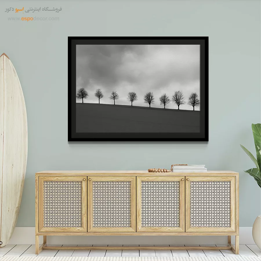 تصویری است که روی کاغذ عکاسی یا متریال صاف چاپ شده و مستقیماً روی یک تخته چوبی صاف (معمولاً MDF یا فیبر) با ضخامت کم پرس میشود و فاقد هرگونه قاب و پوشش شیشهای است. - تابلو قابدار معمولی: