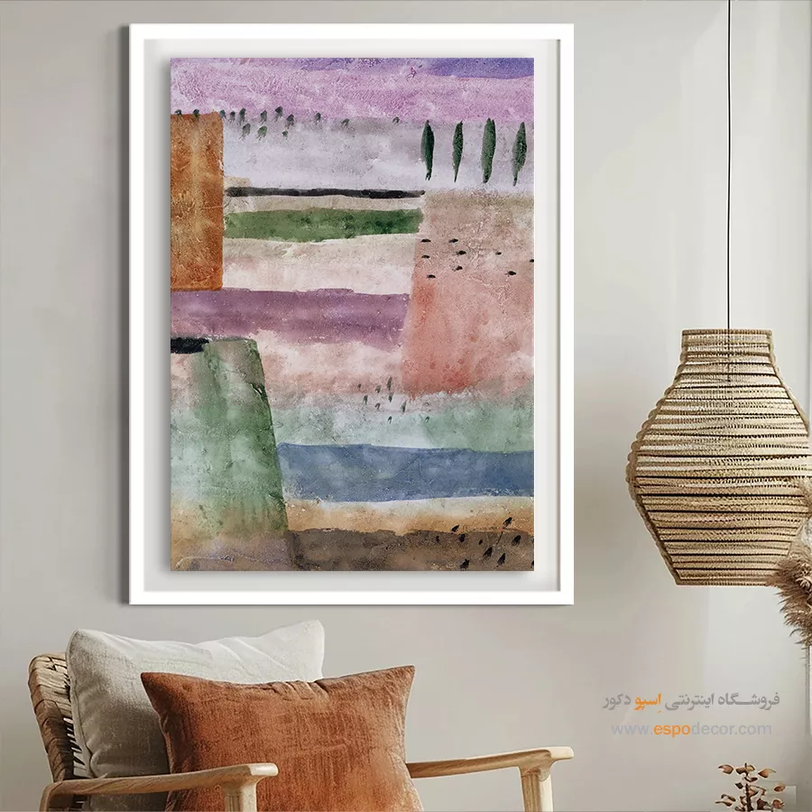 • استفاده از تابلویی با رنگ خنثی در پس‌زمینه: رنگ‌های سفید، خاکستری یا بژ، در حالی که رنگ اصلی دیوار یا رنگ‌های جزئی مبلمان و اکسسوری‌ها در طرح آن تکرار شده باشد. این روش تعادل را در فضا تضمین کرده و از شلوغی بصری جلوگیری می‌کند.
