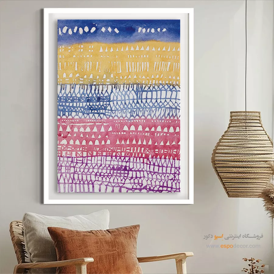 • استفاده از تابلویی با رنگ خنثی در پس‌زمینه: رنگ‌های سفید، خاکستری یا بژ، در حالی که رنگ اصلی دیوار یا رنگ‌های جزئی مبلمان و اکسسوری‌ها در طرح آن تکرار شده باشد. این روش تعادل را در فضا تضمین کرده و از شلوغی بصری جلوگیری می‌کند.