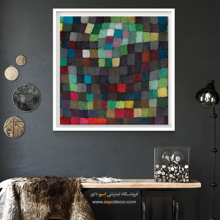 • استفاده از تابلویی با رنگ خنثی در پس‌زمینه: رنگ‌های سفید، خاکستری یا بژ، در حالی که رنگ اصلی دیوار یا رنگ‌های جزئی مبلمان و اکسسوری‌ها در طرح آن تکرار شده باشد. این روش تعادل را در فضا تضمین کرده و از شلوغی بصری جلوگیری می‌کند.