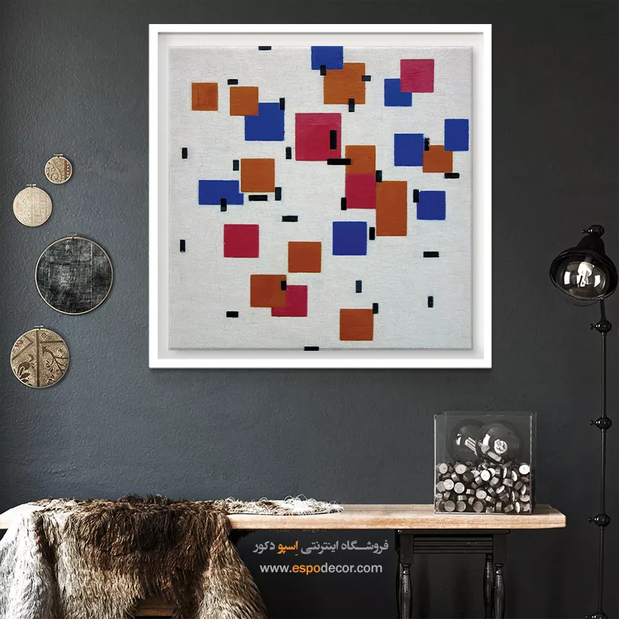 • استفاده از تابلویی با رنگ خنثی در پس‌زمینه: رنگ‌های سفید، خاکستری یا بژ، در حالی که رنگ اصلی دیوار یا رنگ‌های جزئی مبلمان و اکسسوری‌ها در طرح آن تکرار شده باشد. این روش تعادل را در فضا تضمین کرده و از شلوغی بصری جلوگیری می‌کند.