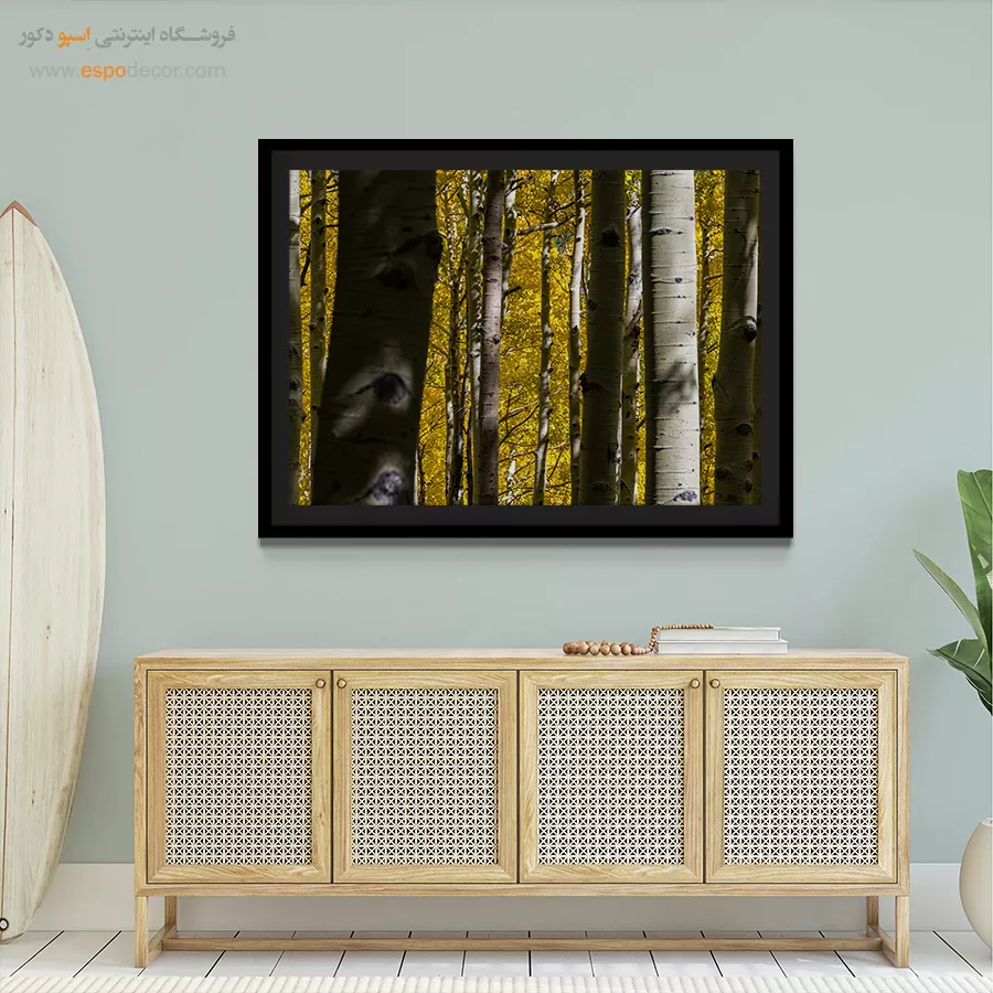 تصویری است که روی کاغذ عکاسی یا متریال صاف چاپ شده و مستقیماً روی یک تخته چوبی صاف (معمولاً MDF یا فیبر) با ضخامت کم پرس میشود و فاقد هرگونه قاب و پوشش شیشهای است. - تابلو قابدار معمولی: