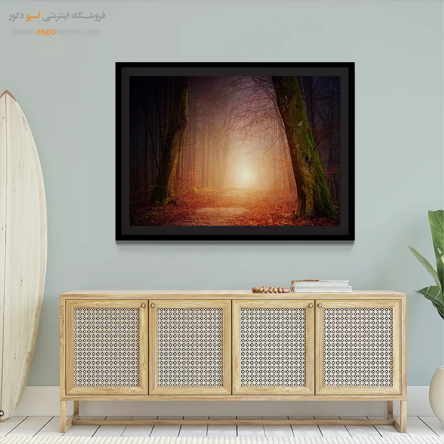 تصویری است که روی کاغذ عکاسی یا متریال صاف چاپ شده و مستقیماً روی یک تخته چوبی صاف (معمولاً MDF یا فیبر) با ضخامت کم پرس میشود و فاقد هرگونه قاب و پوشش شیشهای است. - تابلو قابدار معمولی: