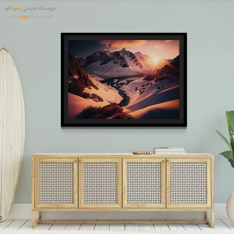• نصب بالای مبلمان: اگر تابلوها بالای مبل یا کنسول نصب می‌شوند، لبه پایینی آن‌ها باید حدود ۱۵ تا ۳۰ سانتی‌متر بالاتر از لبه بالایی مبلمان باشد.