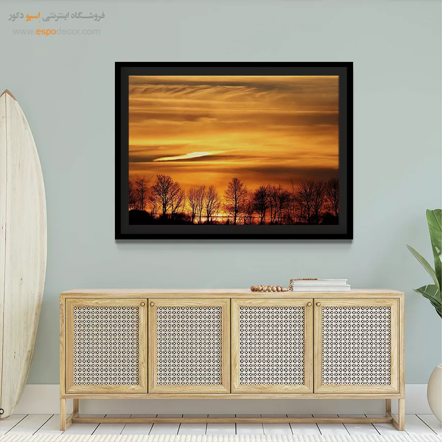 تصویری است که روی کاغذ عکاسی یا متریال صاف چاپ شده و مستقیماً روی یک تخته چوبی صاف (معمولاً MDF یا فیبر) با ضخامت کم پرس میشود و فاقد هرگونه قاب و پوشش شیشهای است. - تابلو قابدار معمولی: