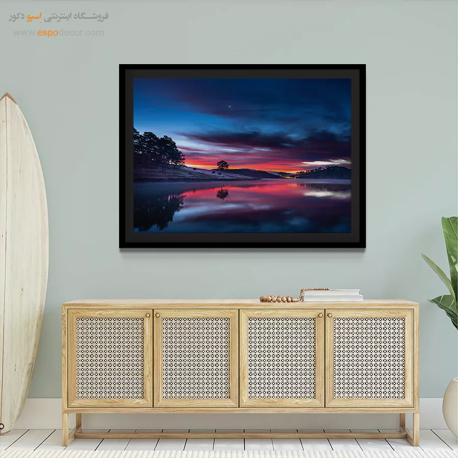 - انتخاب سایههای مختلف از رنگ دیوار: مانند تابلو آبی تیره روی دیوار آبی روشن، که حس آرامش و یکپارچگی در فضا ایجاد میکند.