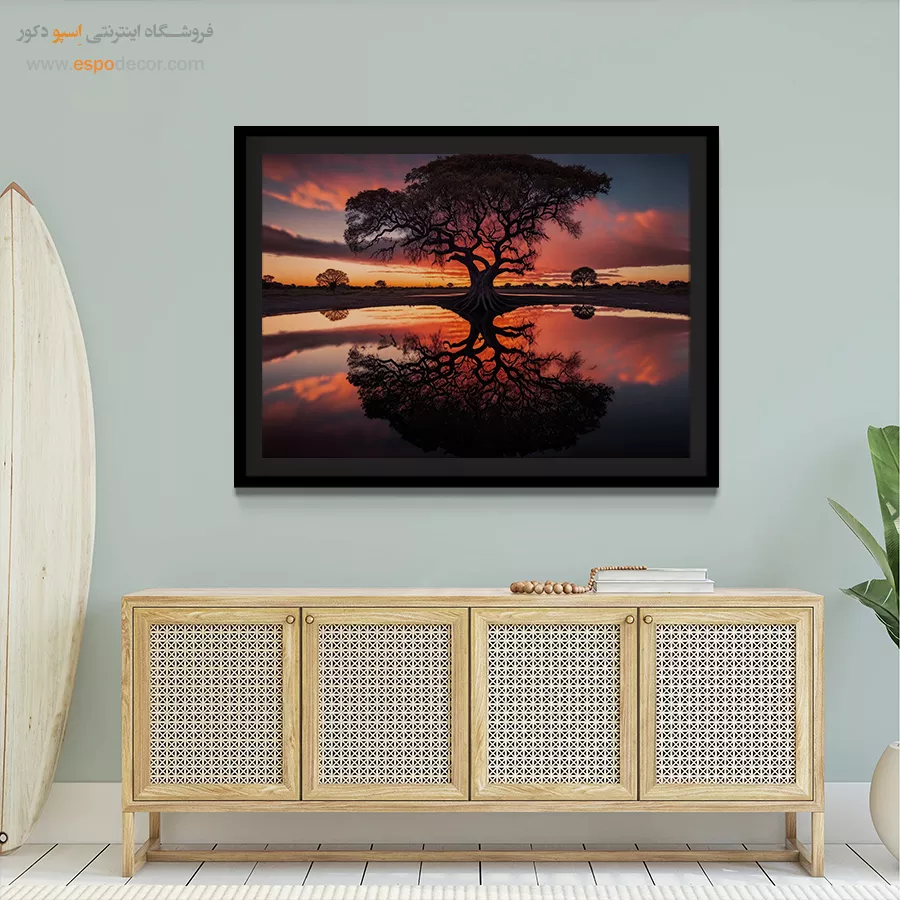تصویری است که روی کاغذ عکاسی یا متریال صاف چاپ شده و مستقیماً روی یک تخته چوبی صاف (معمولاً MDF یا فیبر) با ضخامت کم پرس میشود و فاقد هرگونه قاب و پوشش شیشهای است. - تابلو قابدار معمولی: