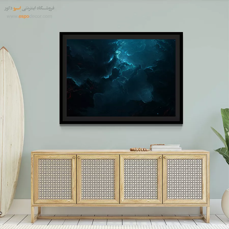 - انتخاب سایههای مختلف از رنگ دیوار: مانند تابلو آبی تیره روی دیوار آبی روشن، که حس آرامش و یکپارچگی در فضا ایجاد میکند.