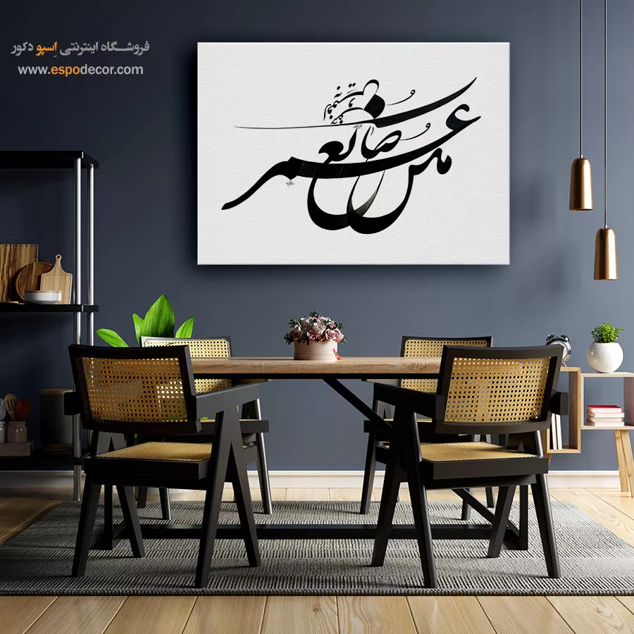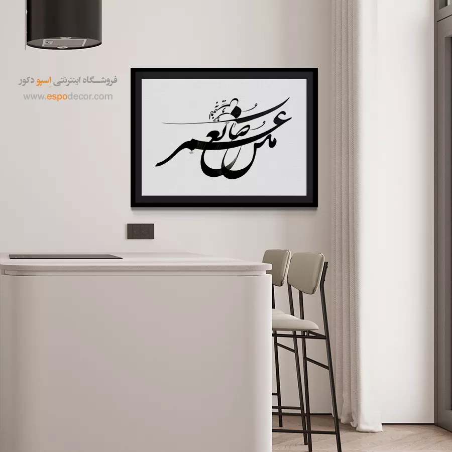 این تابلو نمونهای کامل از پیوند سنت و مدرنیته است. سیاهی قدرتمند خطوط، یادآور اصالت خوشنویسی ایرانی است و زمینه سفید ساده، بیانی معاصر و نوین به آن داده است. این تضاد بصری، دیوارهای ساده را به نقطهای کانونی و فاخر تبدیل میکند.