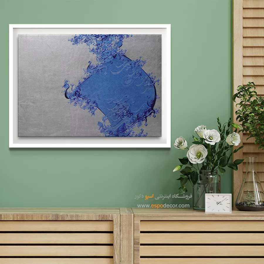 تابلوی «نقطه عشق» با رنگ غالب آبی و زمینه نقرهای درخشان، فضایی شاعرانه و مدرن خلق کرده است. انبوه خطوط و تکرارهای خوشنویسی در دل این بوم، جلوهای از بیپایانی عشق را به تصویر میکشند. تضاد میان درخشش فلزی نقرهای و لطافت آبی، حس آرامش، سکوت و تأمل را در کنار شکوه و زیبایی به بیننده منتقل میکند.
