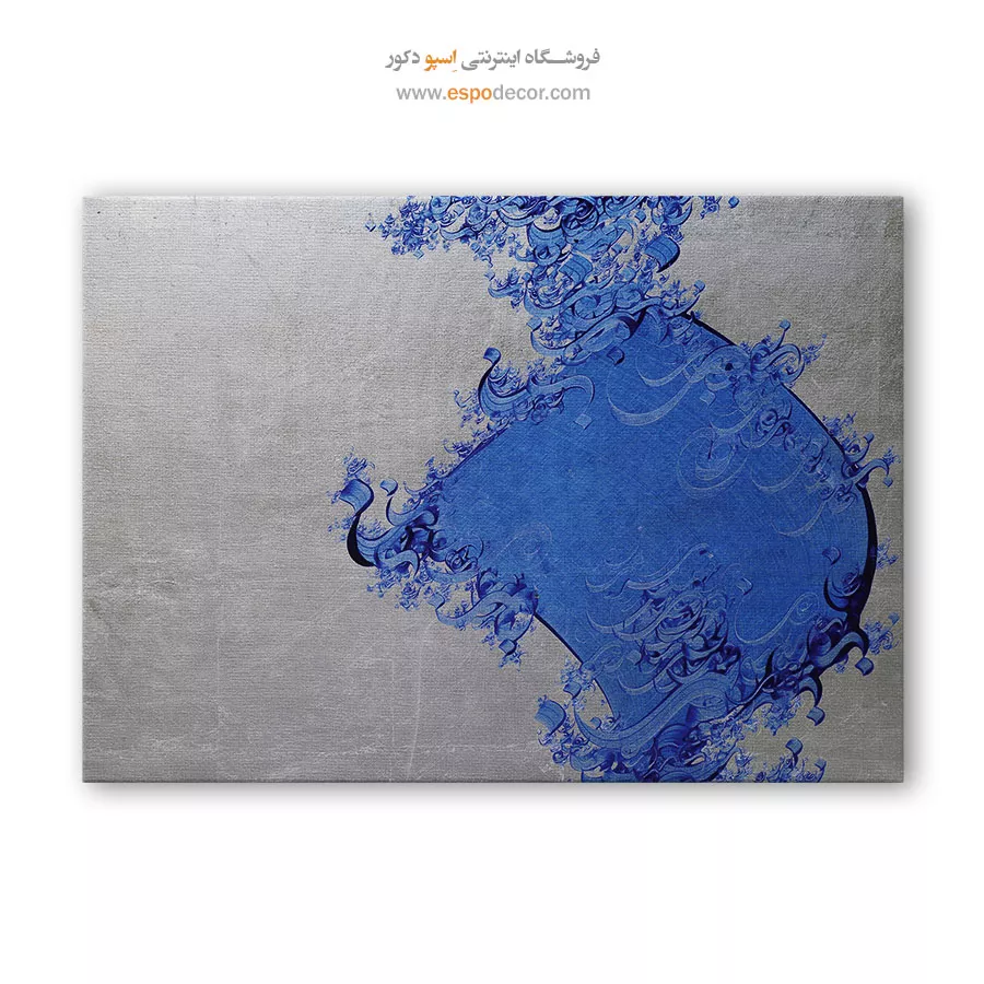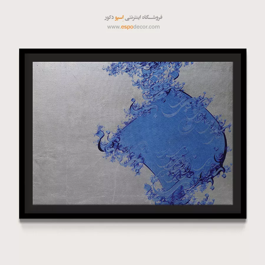 آبی درخشان در میان پسزمینهی نقرهای چونان جواهری خیرهکننده میدرخشد و انبوه خطوط خوشنویسی را در دل خود جای داده است. حرکتهای پرجزئیات و تکرار واژهها، حس بیپایانی عشق و سرمستی را به تصویر کشیده و فضایی باشکوه و آرام آفریدهاند.