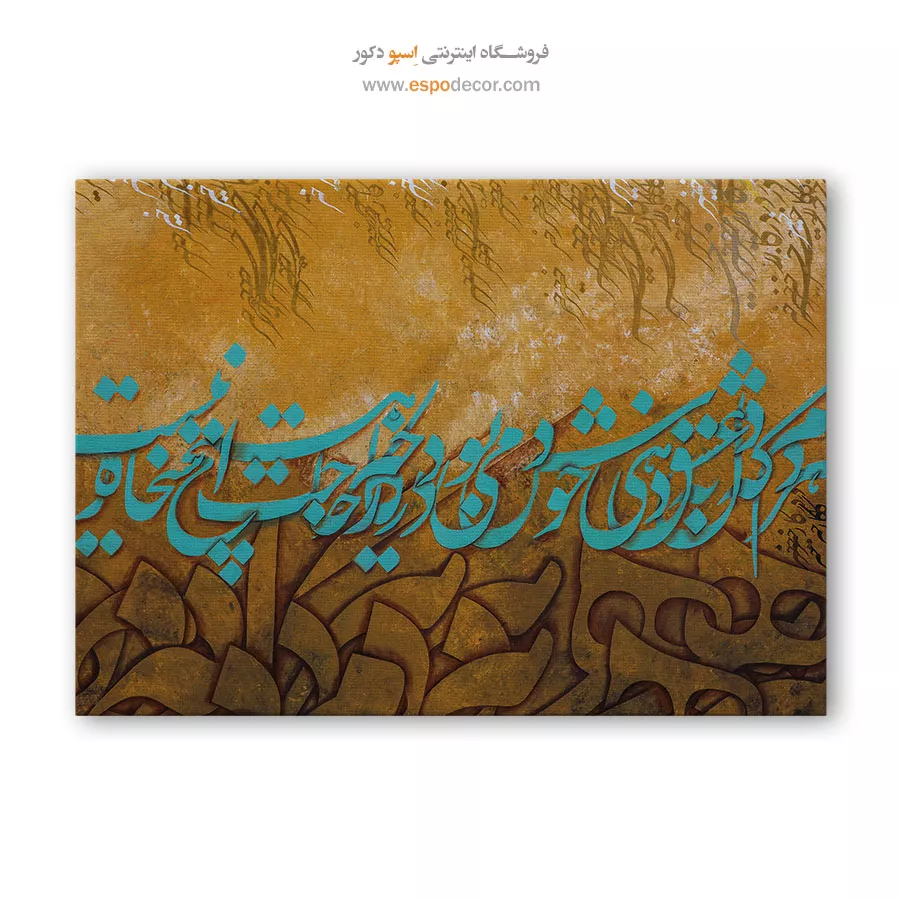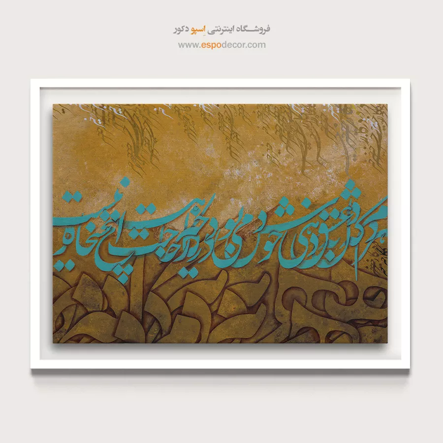 زمینه طلایی بافتدار، چونان خورشیدی درخشان، با خطوط فیروزهای پرطراوت در هم تنیده شده است. تضاد میان این دو رنگ، اثری زنده و پرهیجان ساخته که نگاه را درگیر حرکت روان کلمات میکند.