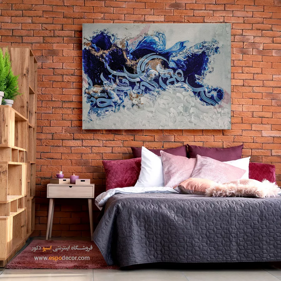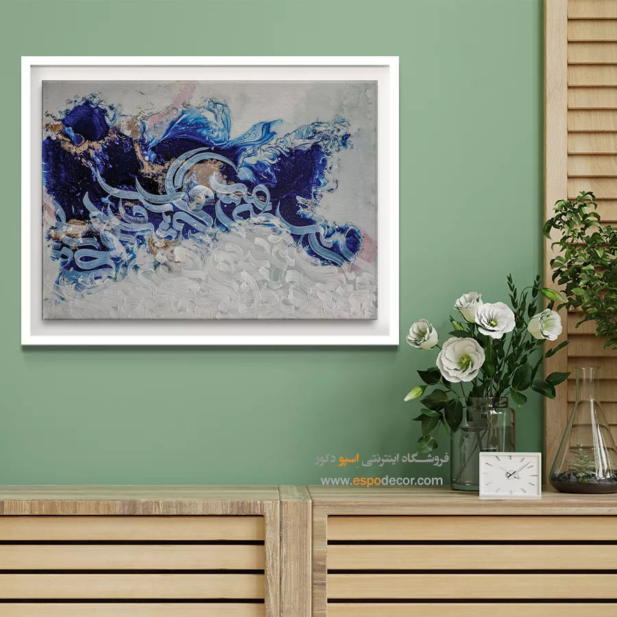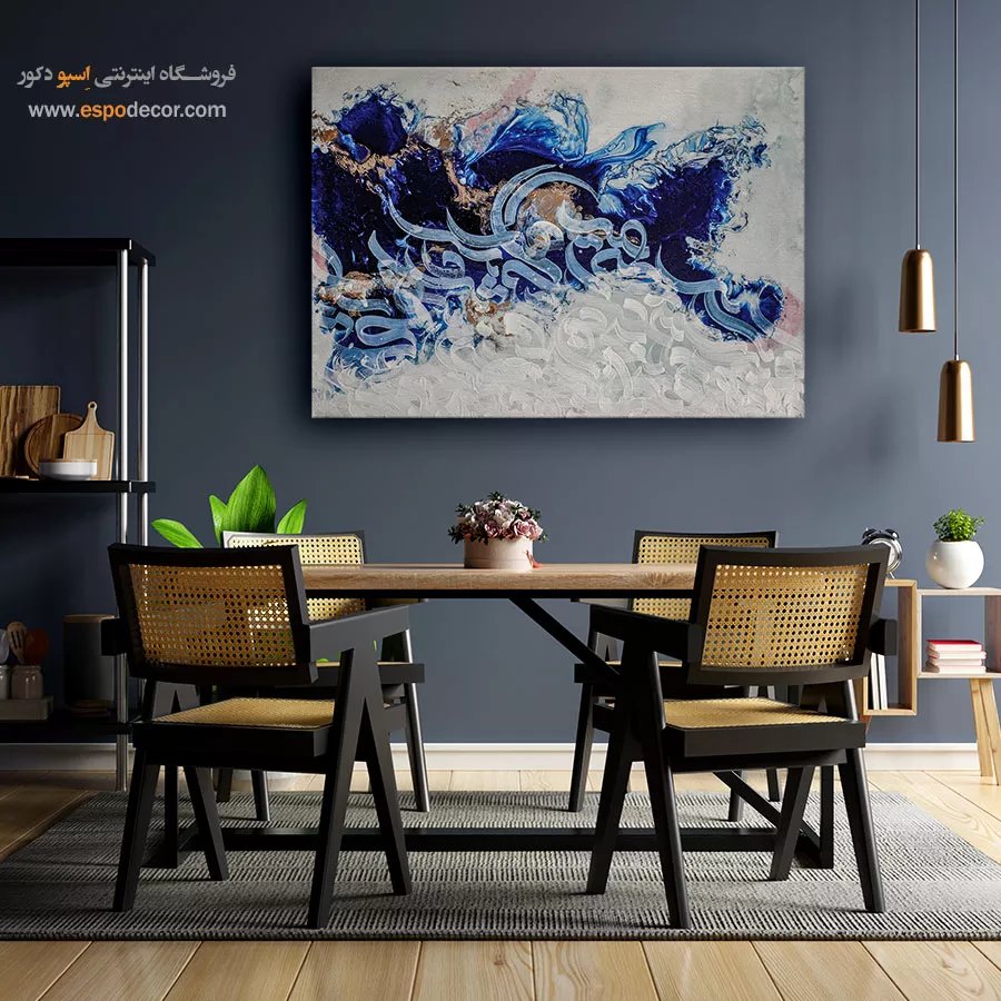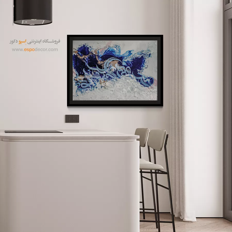 حضور رنگ آبی همواره مایه آرامش و تعادل در طراحی داخلی بوده است. در این تابلو، آبی تیره فضایی عمیق و رازآلود می‌سازد و سفید، روشنایی و امید را به محیط می‌افزاید. ترکیب این رنگ‌ها به‌عنوان نقطه کانونی در سالن نشیمن، اتاق مطالعه یا دفتر کار جلوه‌ای خاص خواهد داشت و دیوارهای ساده را به مرکز توجه تبدیل می‌کند. این اثر با مبلمان روشن یا تیره، هارمونی چشمگیری ایجاد می‌نماید.
