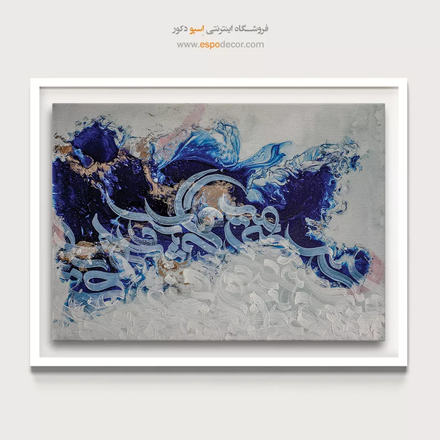 رنگ‌های آبی تیره و سفید در این تابلو همچون رقص ابر و موج در آسمان و دریا به هم آمیخته‌اند. حرکت سیال خطوط خوشنویسی، هماهنگی طبیعت و هنر را یادآور می‌شود و ترکیبی آرامش‌بخش و پرشکوه آفریده است.
