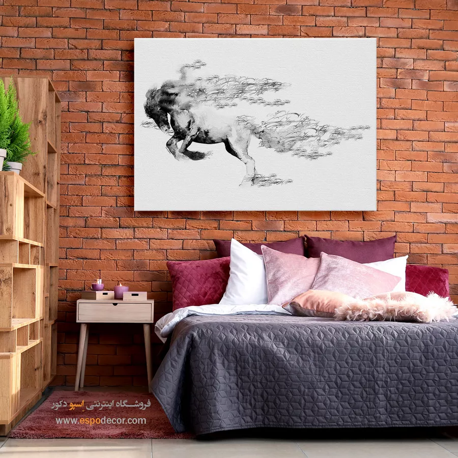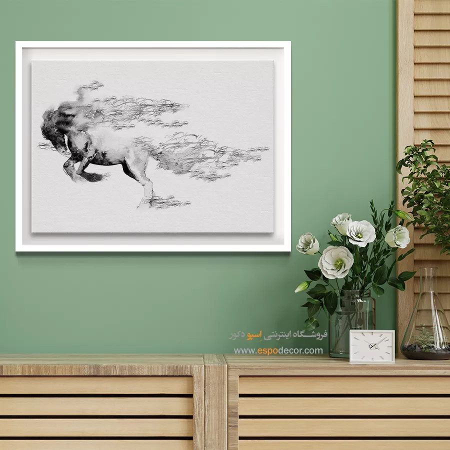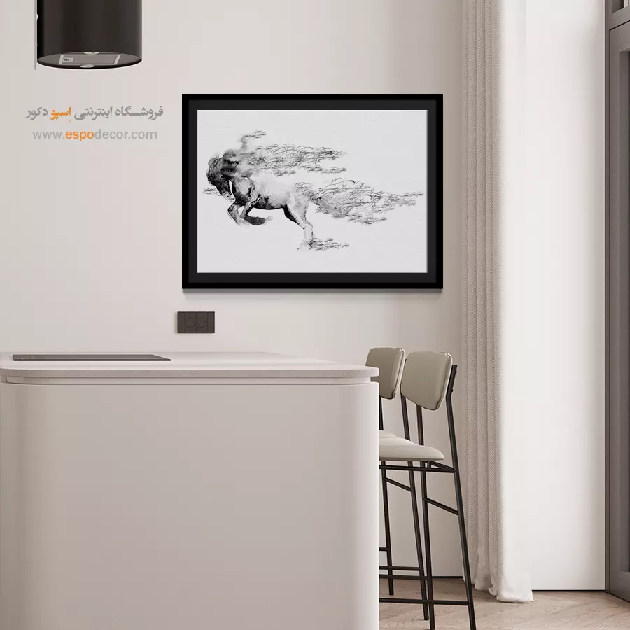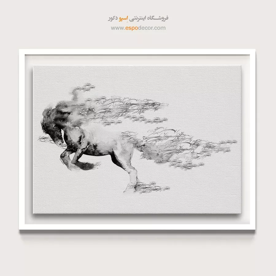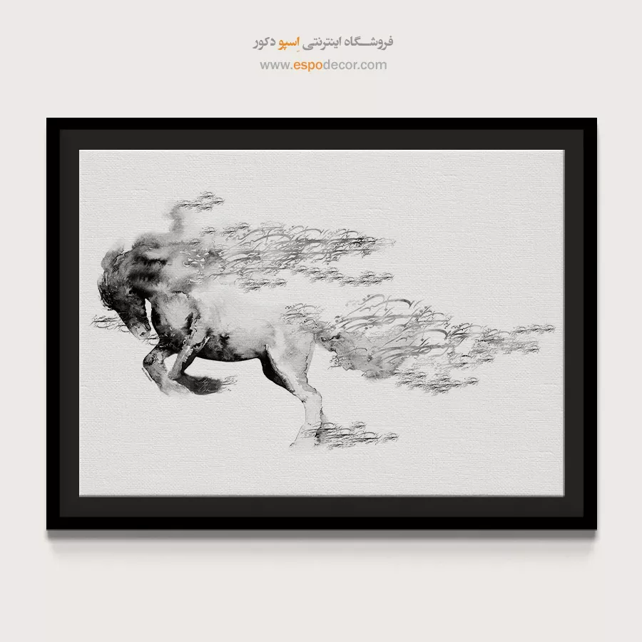 خرید تابلو خط زیبا با چنین طراحی‌ای انتخابی است که هر محیط ساده‌ای را به فضایی مملو از انرژی، حرکت و معنا تبدیل می‌کند. در اتاق نشیمن، دفتر کار یا گالری هنری، این تابلو با حضور پرصلابت خود مرکز توجه خواهد بود. جریان خطوطی که از بدن اسب جاری شده‌اند، یادآور حرکت باد و سیالیت روح است و همین موضوع اثر را از یک تصویر صرف فراتر می‌برد.