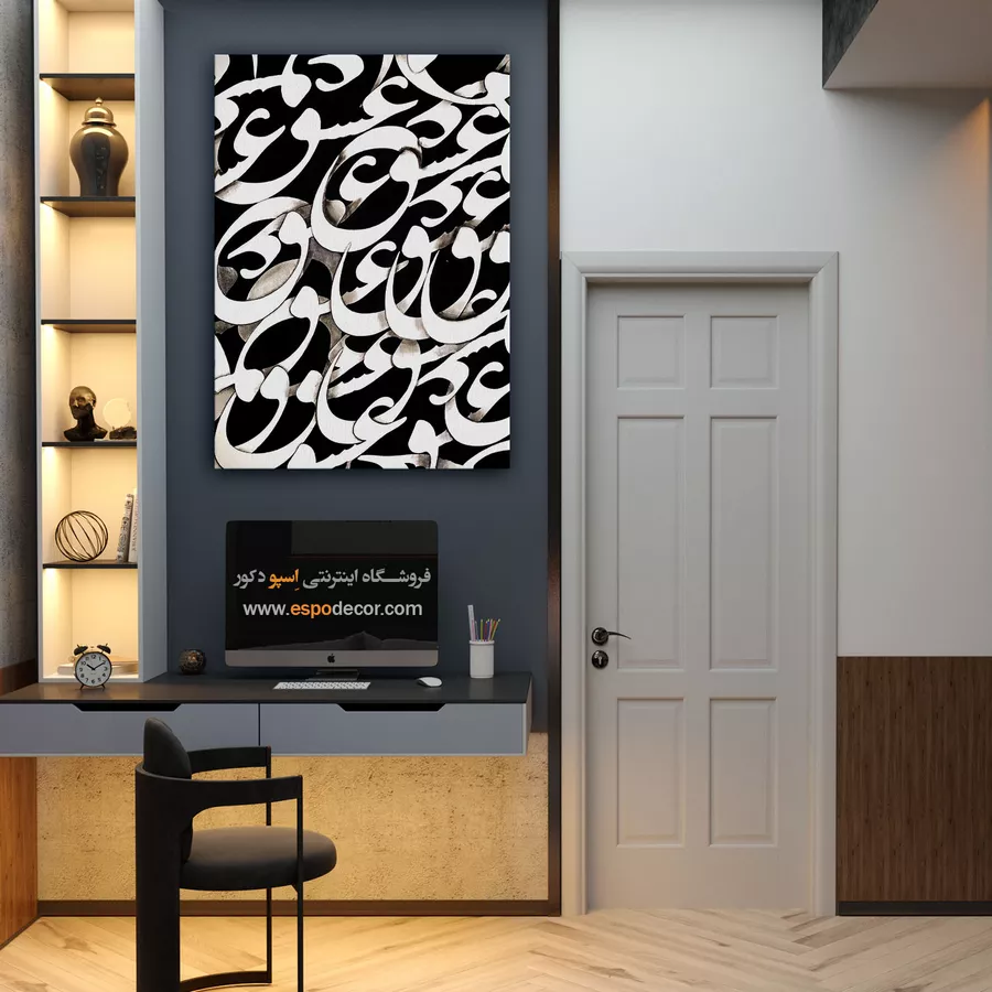 این تابلو با تضاد پرقدرت رنگهای سیاه و سفید، اوج تعادل میان تاریکی و روشنایی را به نمایش میگذارد؛ خطوط نرم و پرانرژی خوشنویسی، مفهومی عمیق از عشق و دوگانگی جهان را در قالبی مینیمال و چشمنواز بازتاب میدهند.