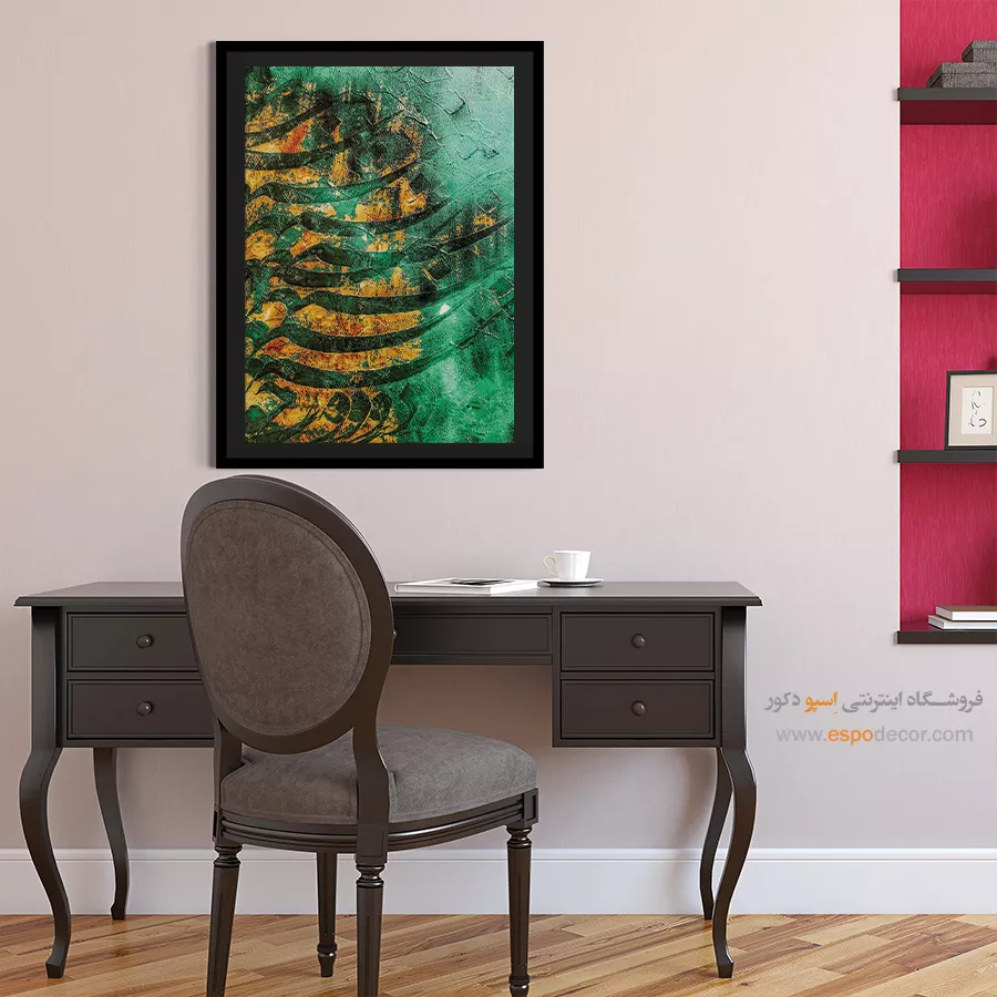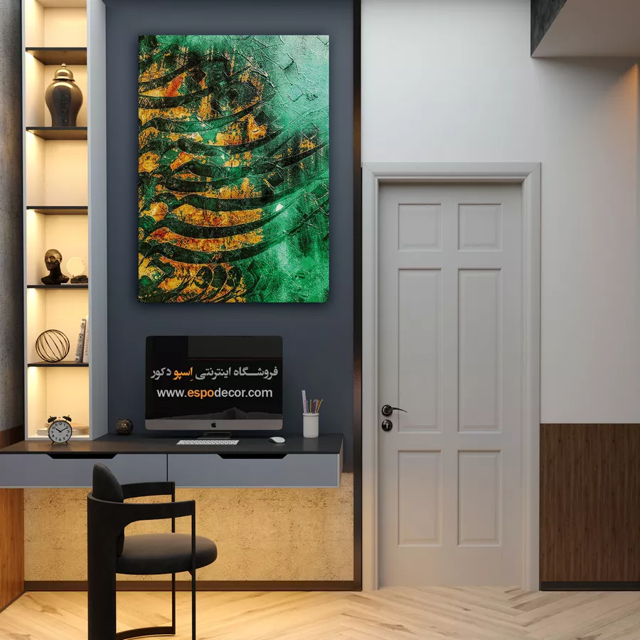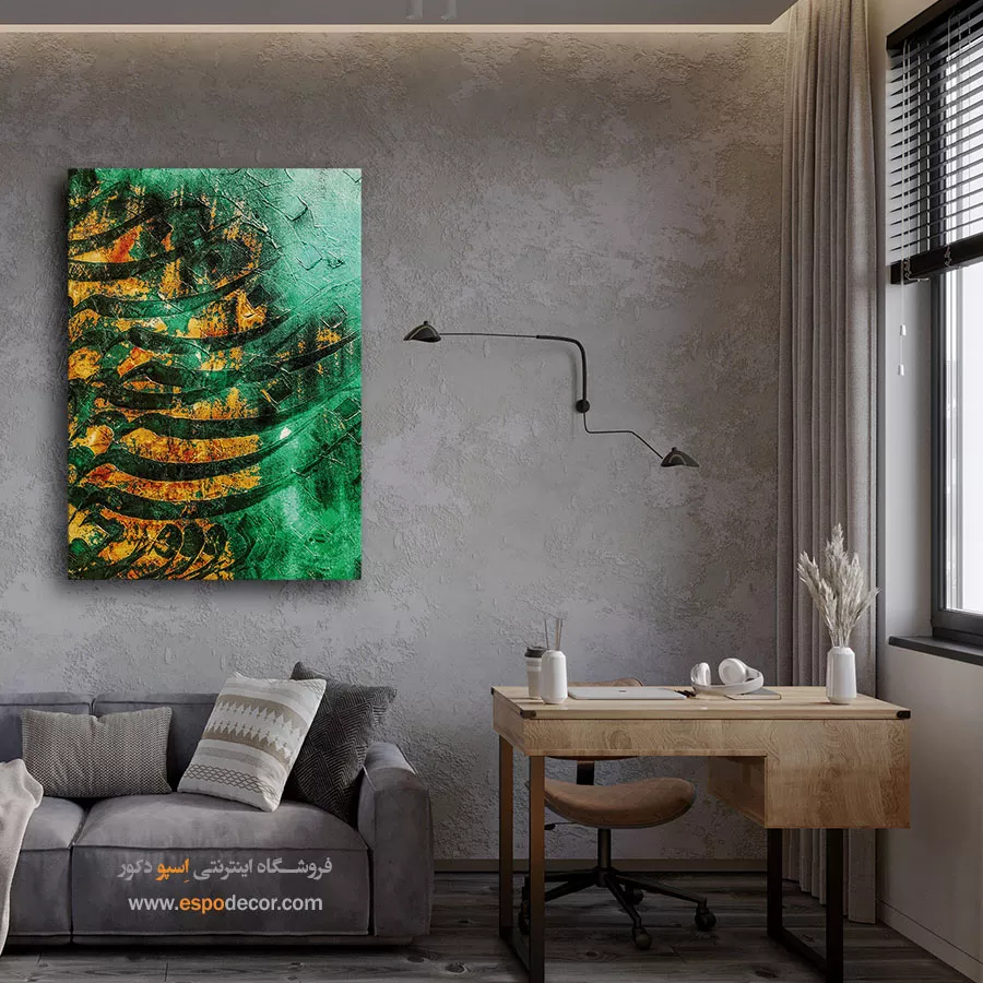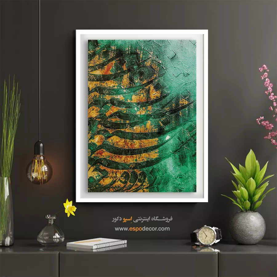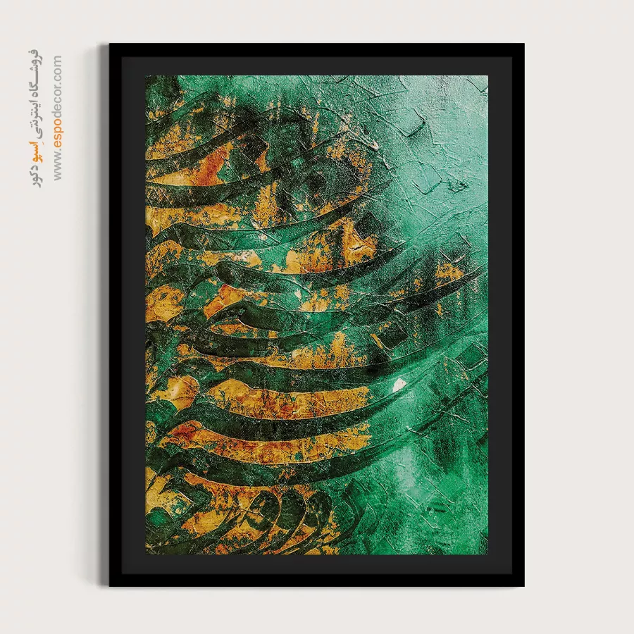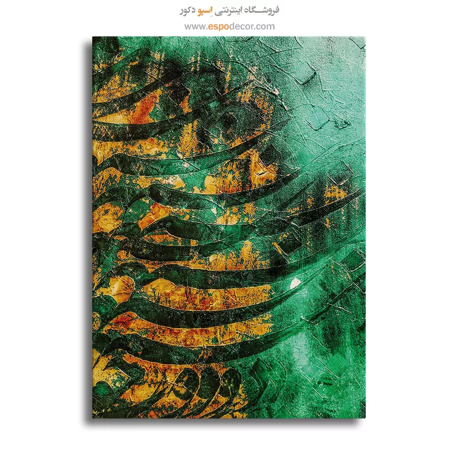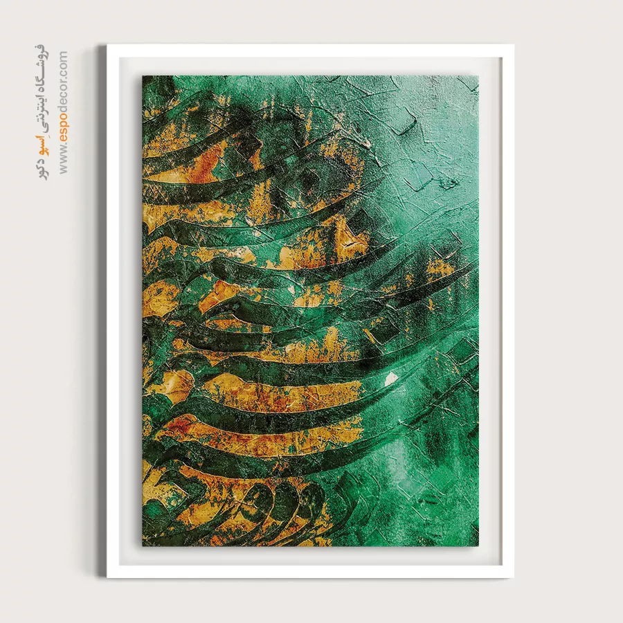 رنگ سبز در این تابلو نشانهای از آرامش، امید و پیوند با طبیعت است و طلایی بهعنوان رنگ شکوه و معنویت، به آن بعدی لوکس و درخشان میبخشد. ترکیب این دو رنگ، فضایی دلنشین و در عین حال باشکوه میسازد که برای سالنهای پذیرایی، دفاتر هنری و حتی فضاهای مینیمال، انتخابی ایدهآل محسوب میشود.