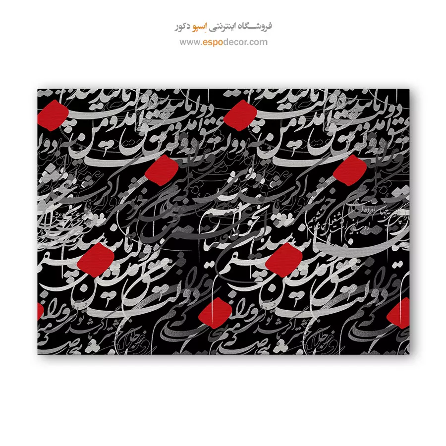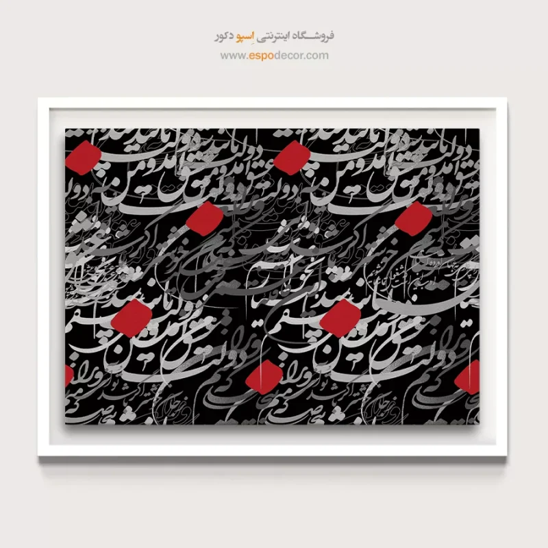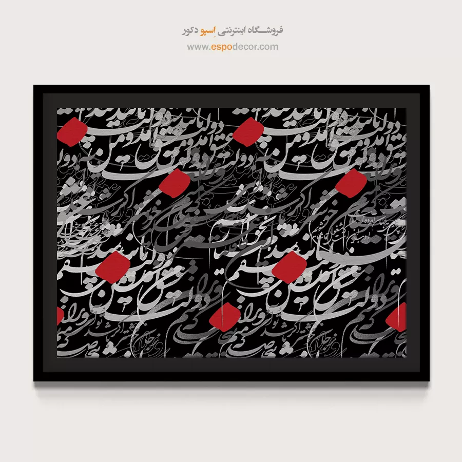 این تابلو جلوهای چشمگیر از خط شکسته نستعلیق است که در بستری سیاه، با خطوط نقرهای و خاکستری شکوهی خاص یافته و با لکههای قرمز پرانرژی، ضرباهنگی مدرن و معاصر به خود گرفته است. این اثر با ترکیب سنت و نوآوری، روحی متفاوت به هر فضا میبخشد.
