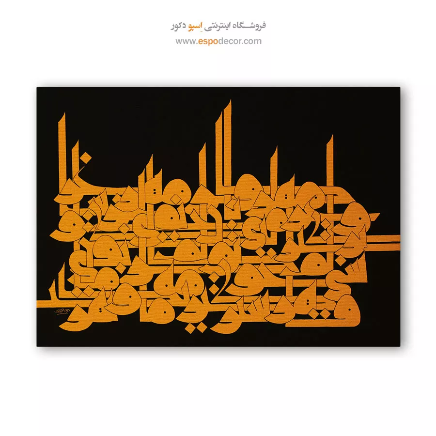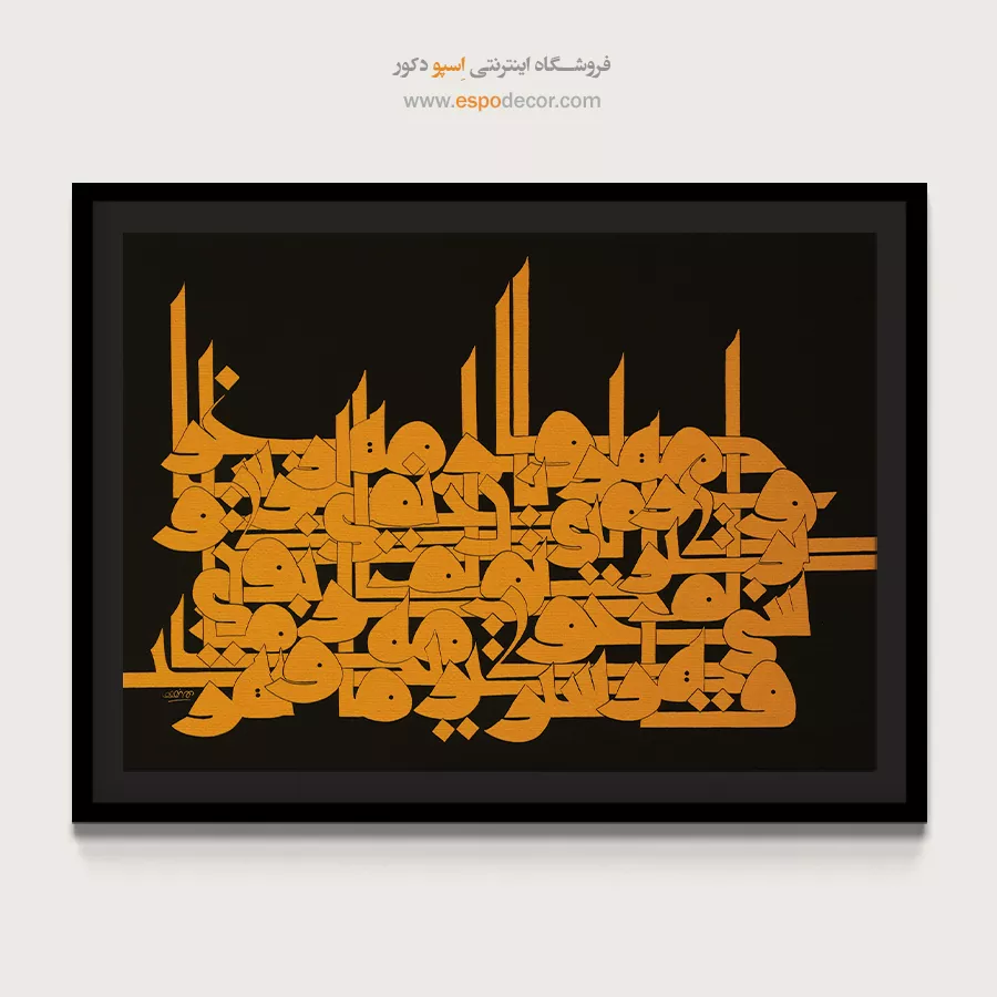 این تابلو با ترکیب چشمگیر رنگ زرد طلایی بر زمینهای مشکی، قدرت خطاطی هندسی و معماریگونه را به رخ میکشد. خطوط منظم و درهمتنیده، یادآور معماری ایرانی ـ اسلامی است که استواری و شکوه را در یک قاب به تصویر میکشد. این اثر، نمادی از عشق و پایبندی به زیباییهای جاودان است.