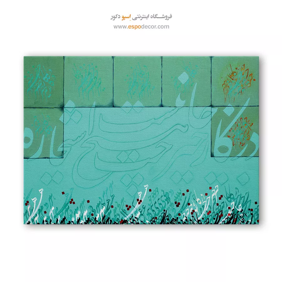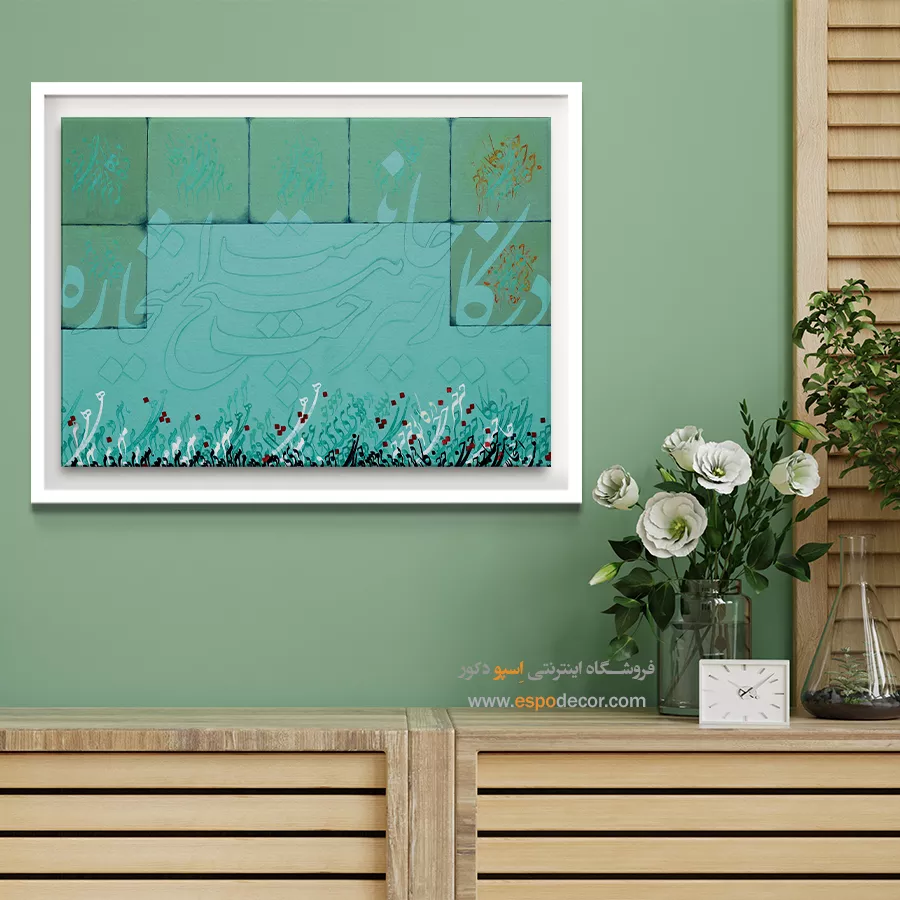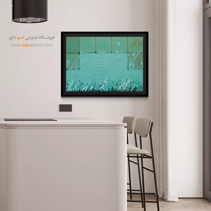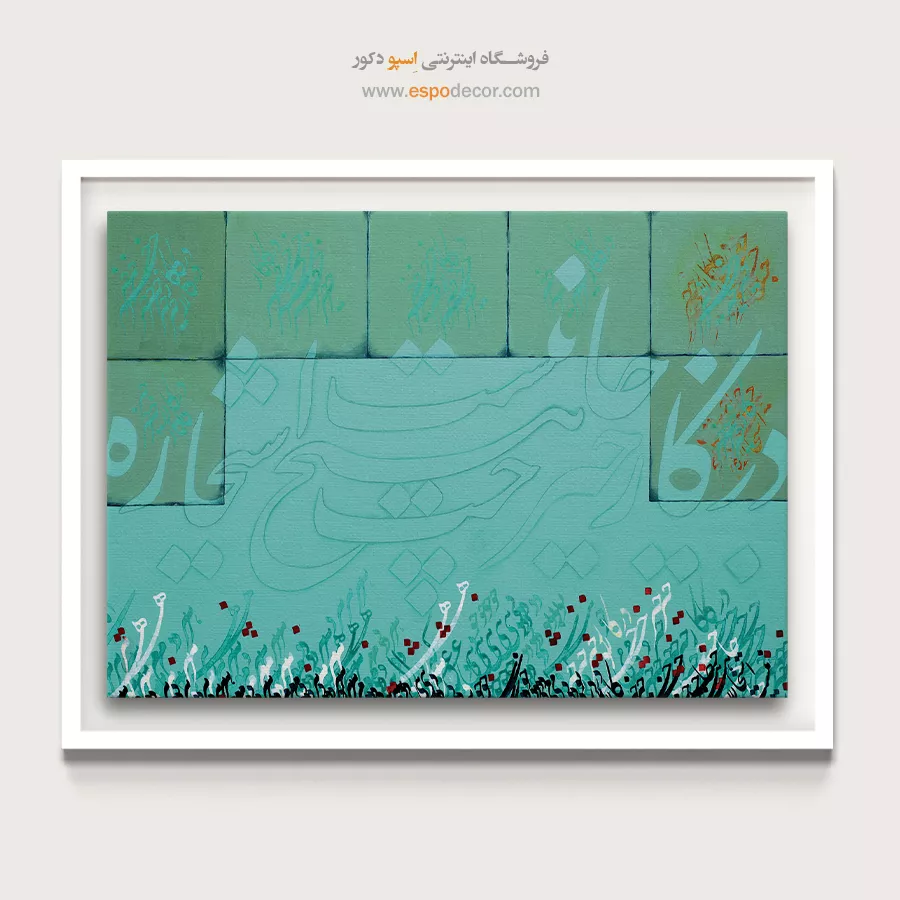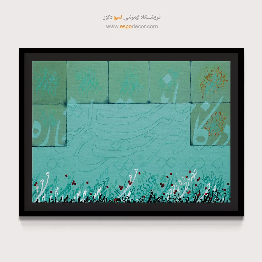این تابلو با رنگ غالب سبز و آبی فیروزهای، سرزندگی و امید را در قالب خوشنویسی مدرن به نمایش میگذارد. ترکیب خطوط نرم و هماهنگ با رنگهای آرامشبخش، فضایی معنوی و مثبت را القا میکند. این اثر یادآور نیتهای پاک و انرژیهای روشن در زندگی روزمره است.