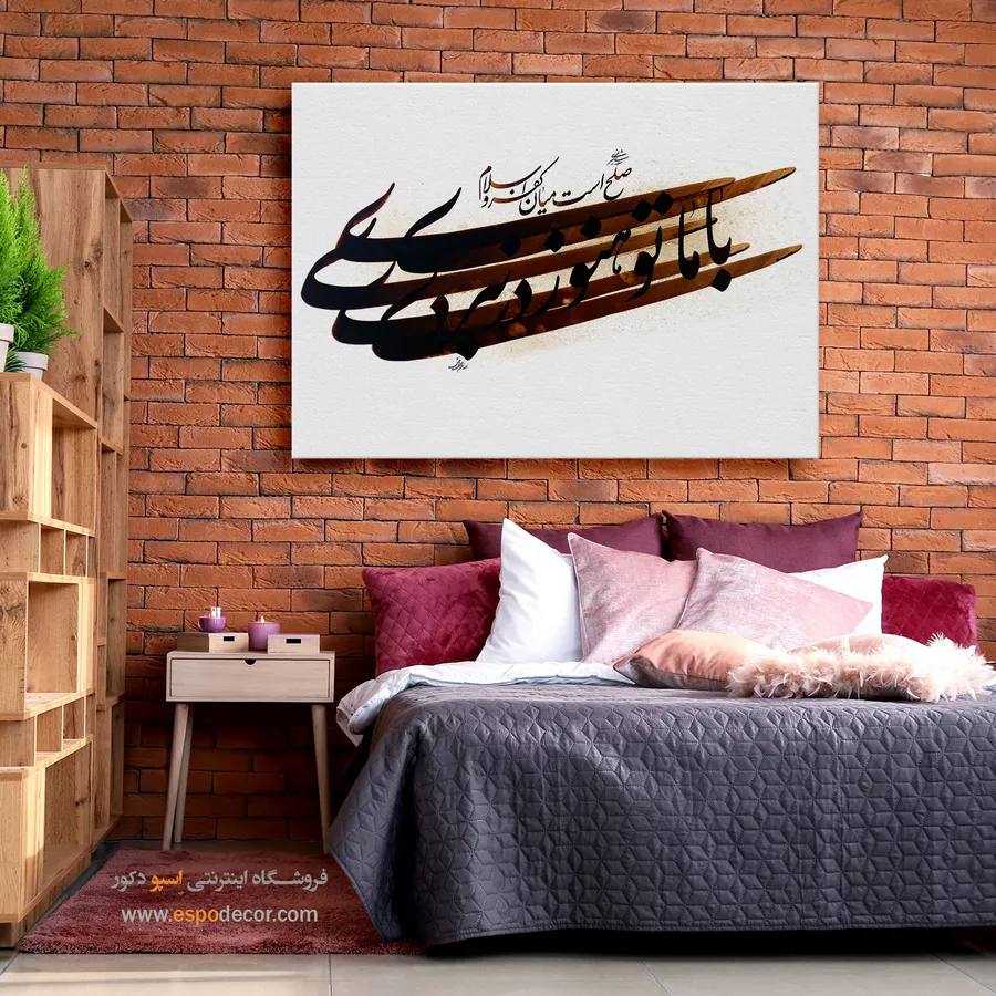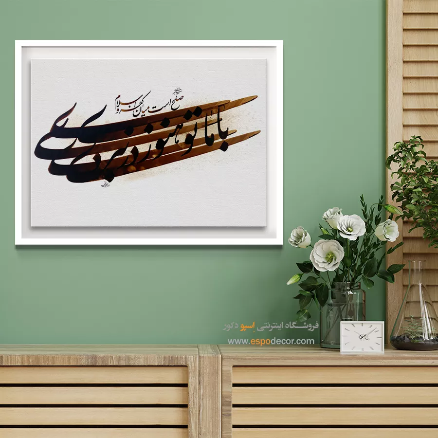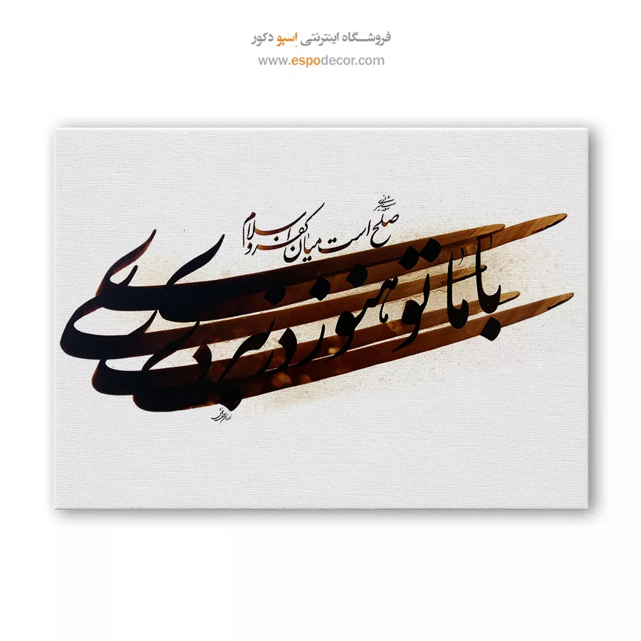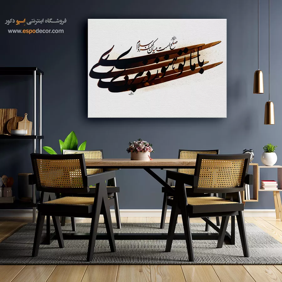این تابلوی دیواری جدید و مدرن با بهرهگیری از خوشنویسی اصیل ایرانی، ترکیبی از معنا، تاریخ و زیباییشناسی را در خود جای داده است. متن اثر، مخاطب را به اندیشهای عمیق درباره مفهوم صلح و نبرد دعوت میکند و در عین حال، جلوهای هنری و دکوراتیو به فضا میبخشد. انتخاب این تابلو نهتنها یک تزئین ساده، بلکه نوعی بیان هنری و فلسفی است.