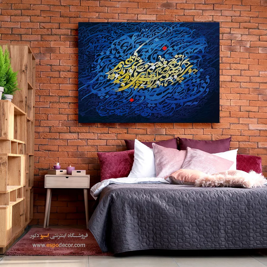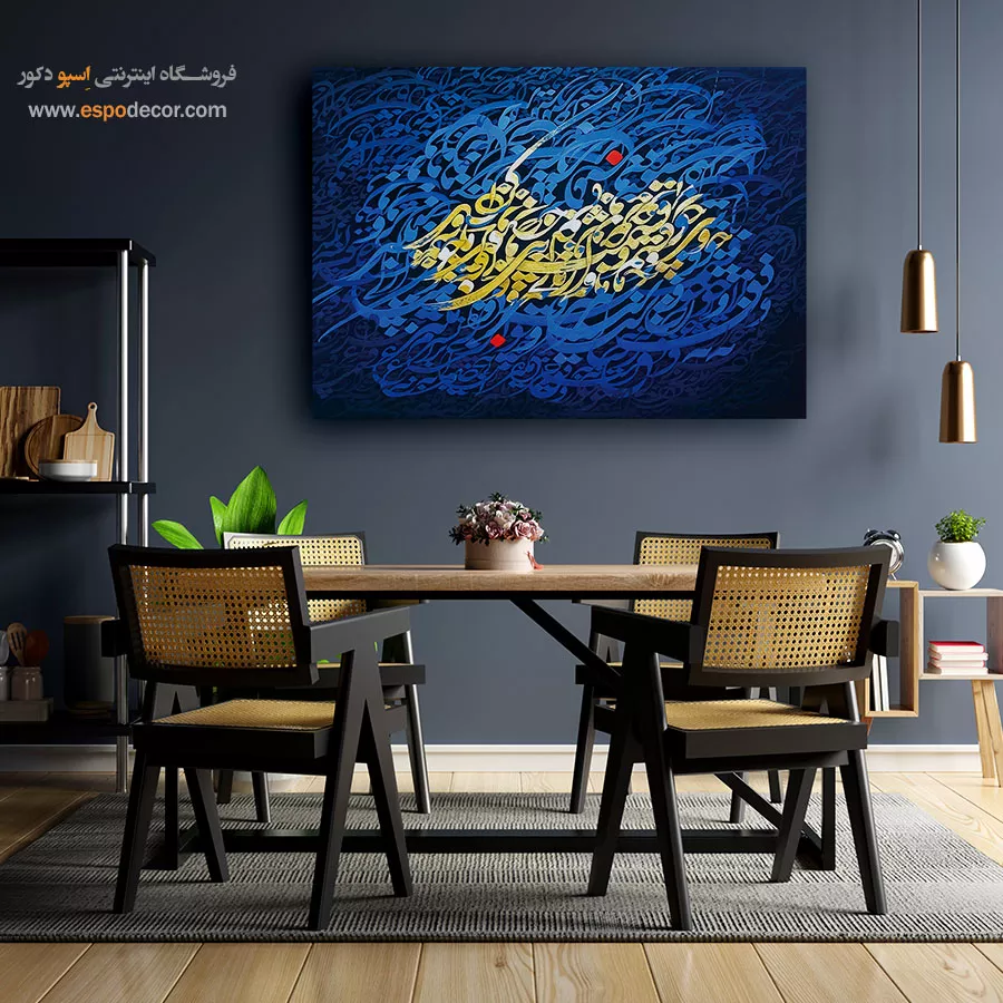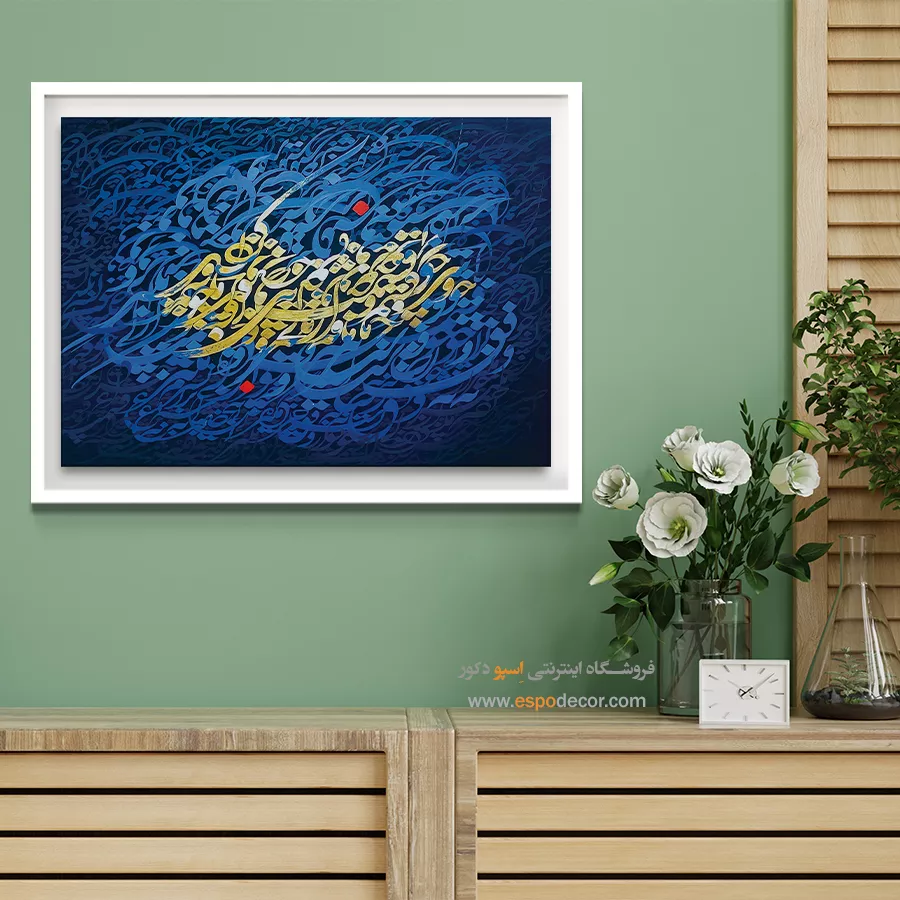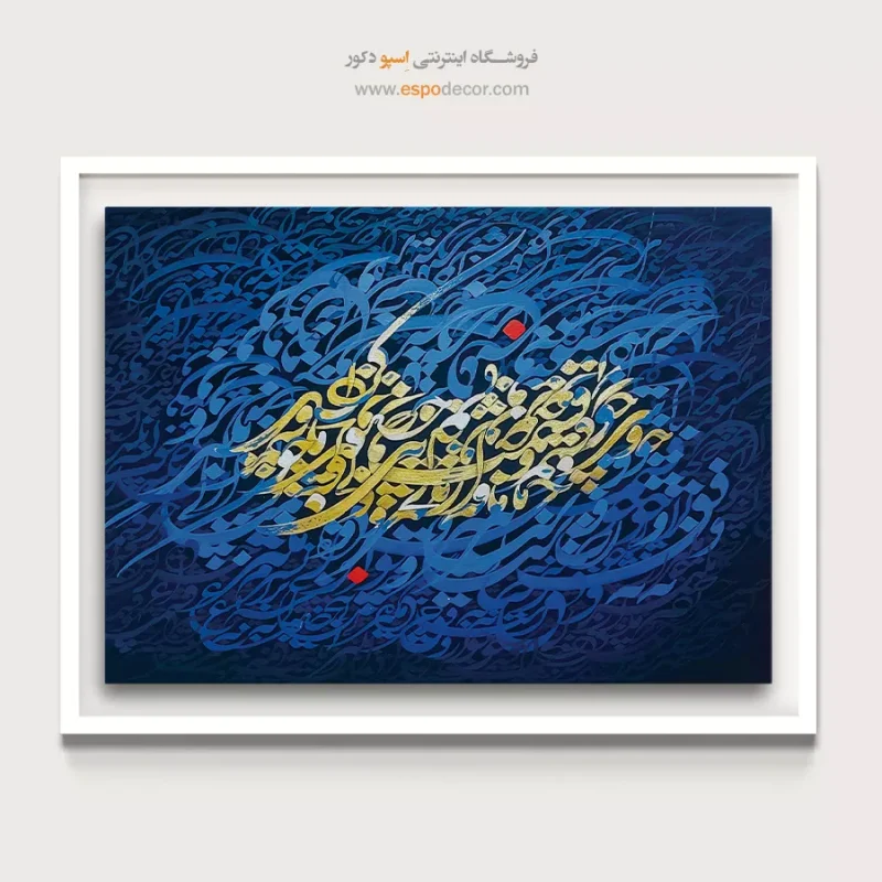 این تابلو با پسزمینه آبی و خطاطی طلایی، جلوهای شاعرانه و عمیق از تقدیر و سرنوشت را به تصویر میکشد. ترکیب تضاد رنگها، حس معنوی و فلسفی این اثر را دوچندان کرده است. مناسب برای علاقهمندان به هنر خوشنویسی و دکوراسیونهای اصیل و مدرن.