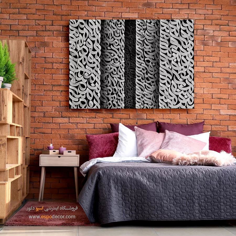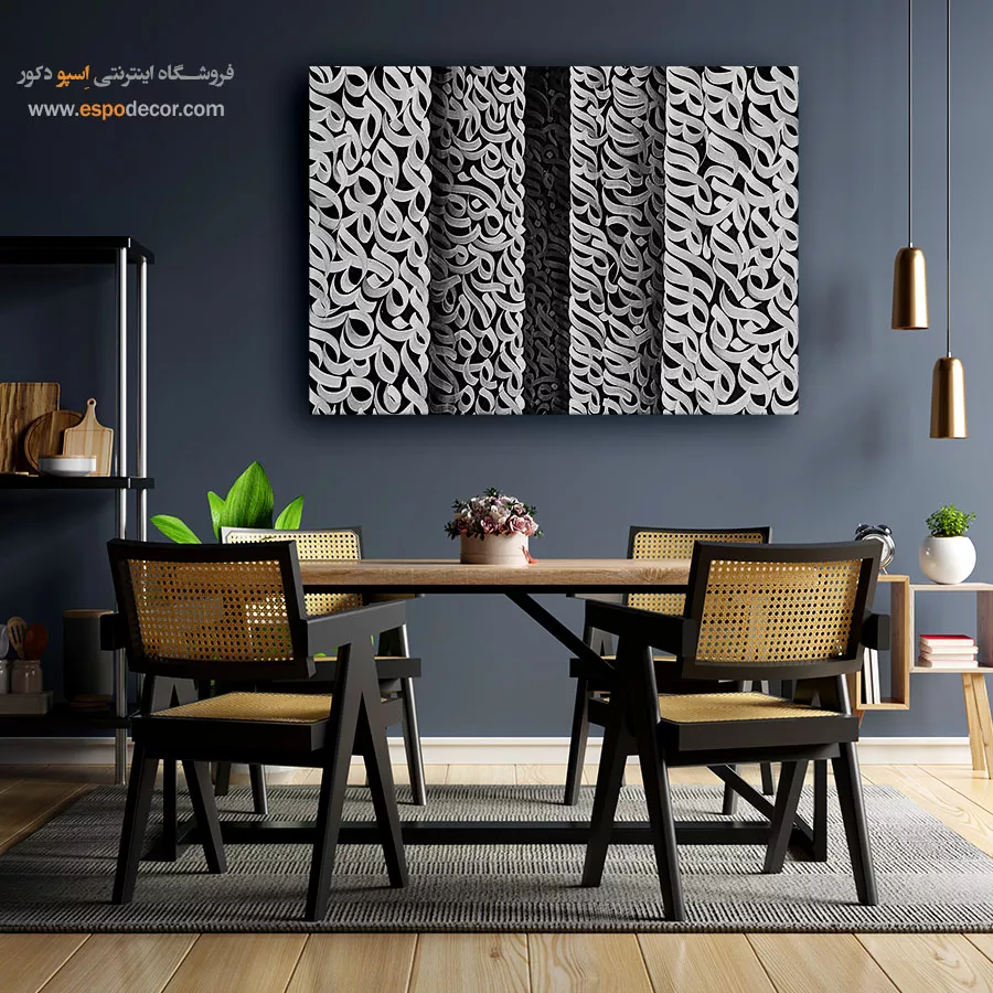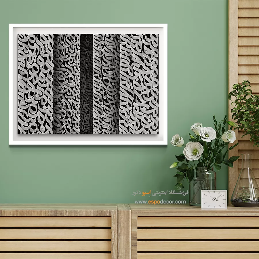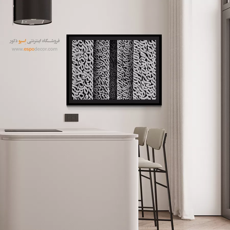 سیاه در این اثر، نماد عمق و رازآلودگی است و سفید یادآور پاکی و روشنایی؛ ترکیب این دو رنگ فضایی متعادل، مینیمال و پرشکوه ایجاد میکند. این تابلو بهویژه برای فضاهای مدرن، سالنهای نشیمن با دیوارهای روشن، اتاقهای مطالعه یا محیطهای کاری مینیمالیستی مناسب است. تضاد رنگی قدرتمند آن، نقطه تمرکز زیبایی در هر دکوراسیونی ایجاد میکند.