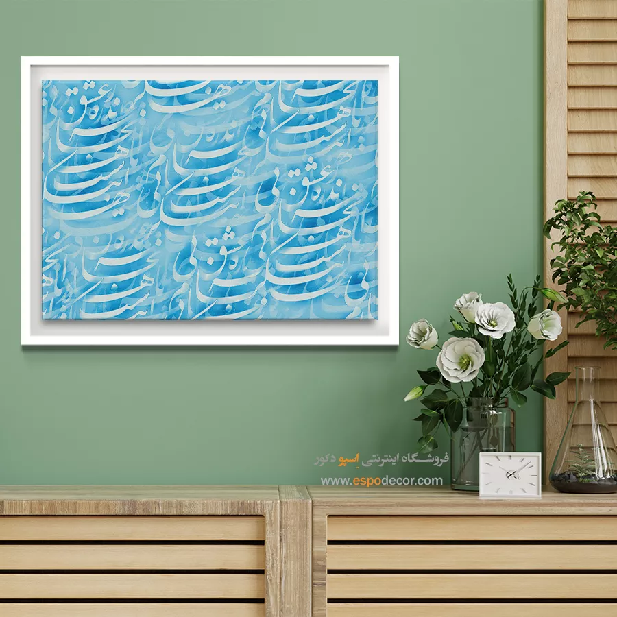 این تابلو سرشار از آرامش، لطافت و جریان بیپایان زندگی است. خطوط خوشنویسی در پسزمینهای آسمانی، حس پاکی و سکون دریا را تداعی میکنند. این اثر فضایی الهامبخش و آرام برای هر خانه یا محیط کاری میآفریند.