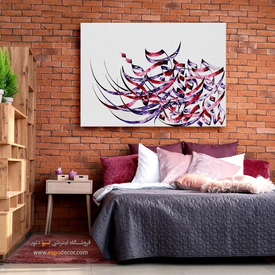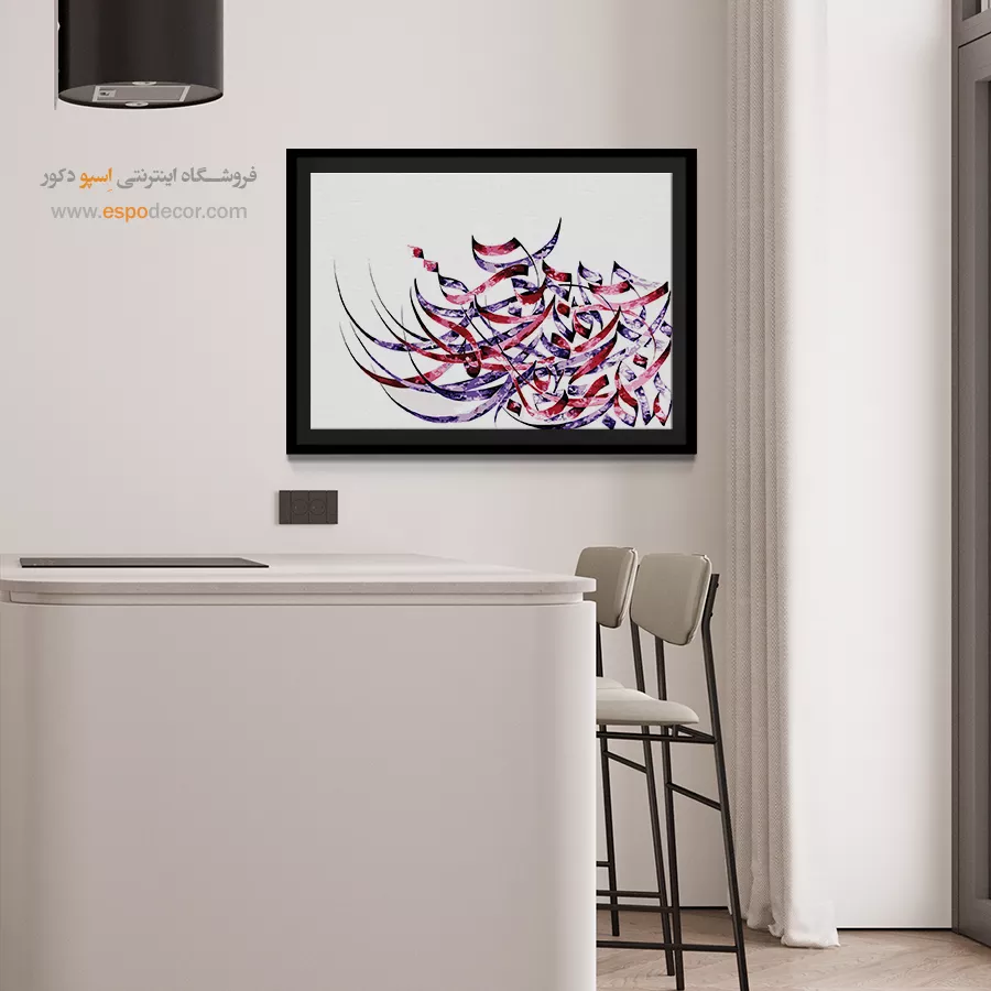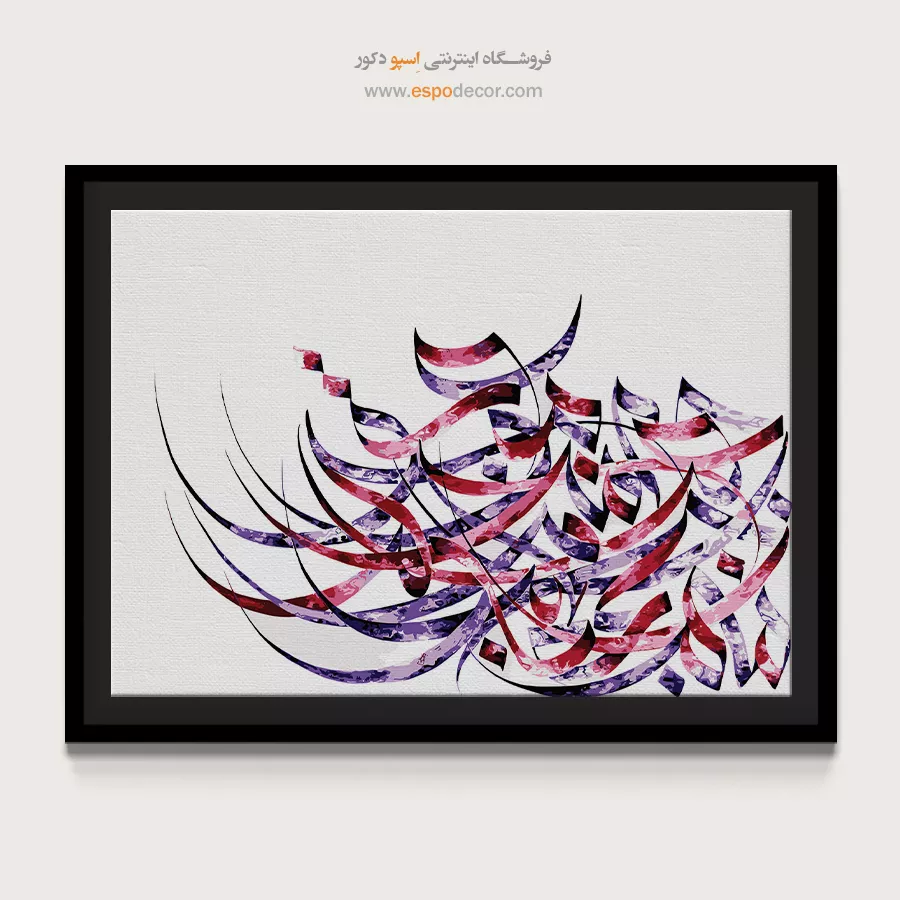 این تابلو جلوهای شاعرانه از شور درونی و زیبایی خوشنویسی ایرانی است.رنگهای سرخ و بنفش در خطوط، حال و هوای عاشقانه و پرشور اثر را دوچندان کردهاند.این تابلو میتواند فضای خانه یا محل کار را با انرژی و لطافت هنری دگرگون کند.