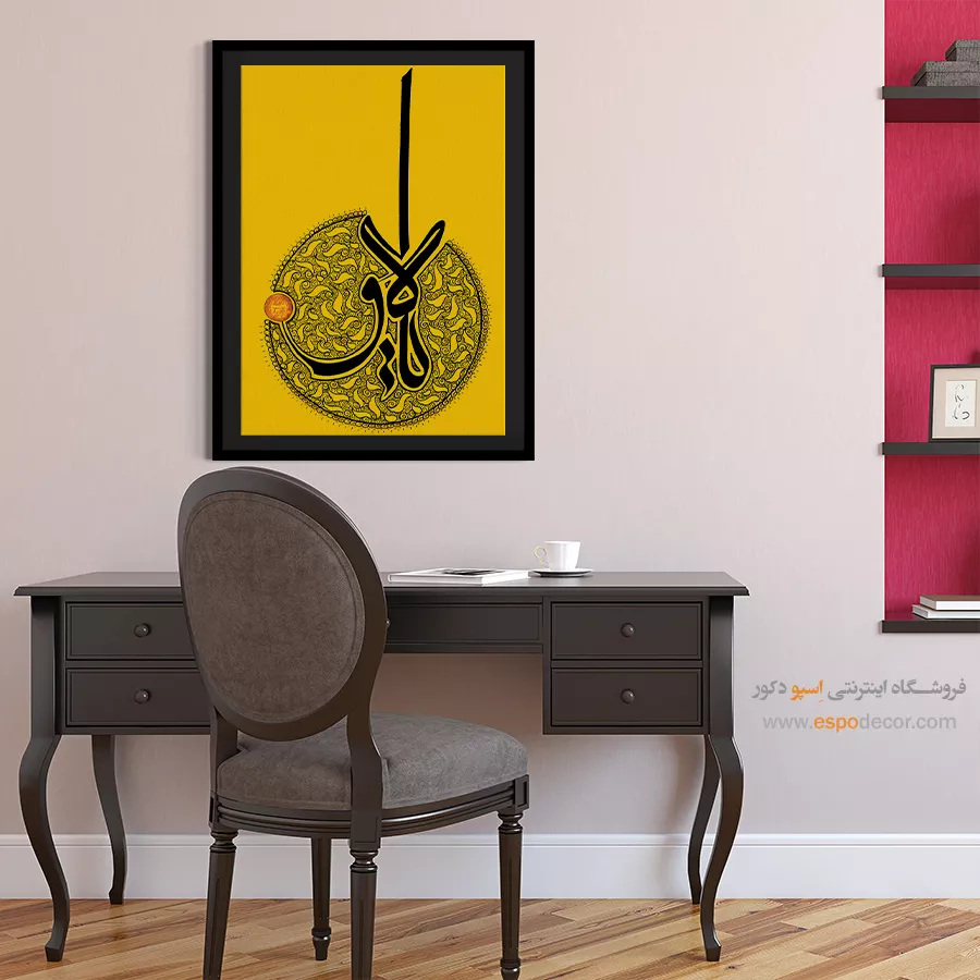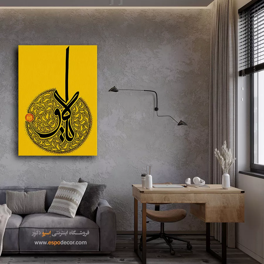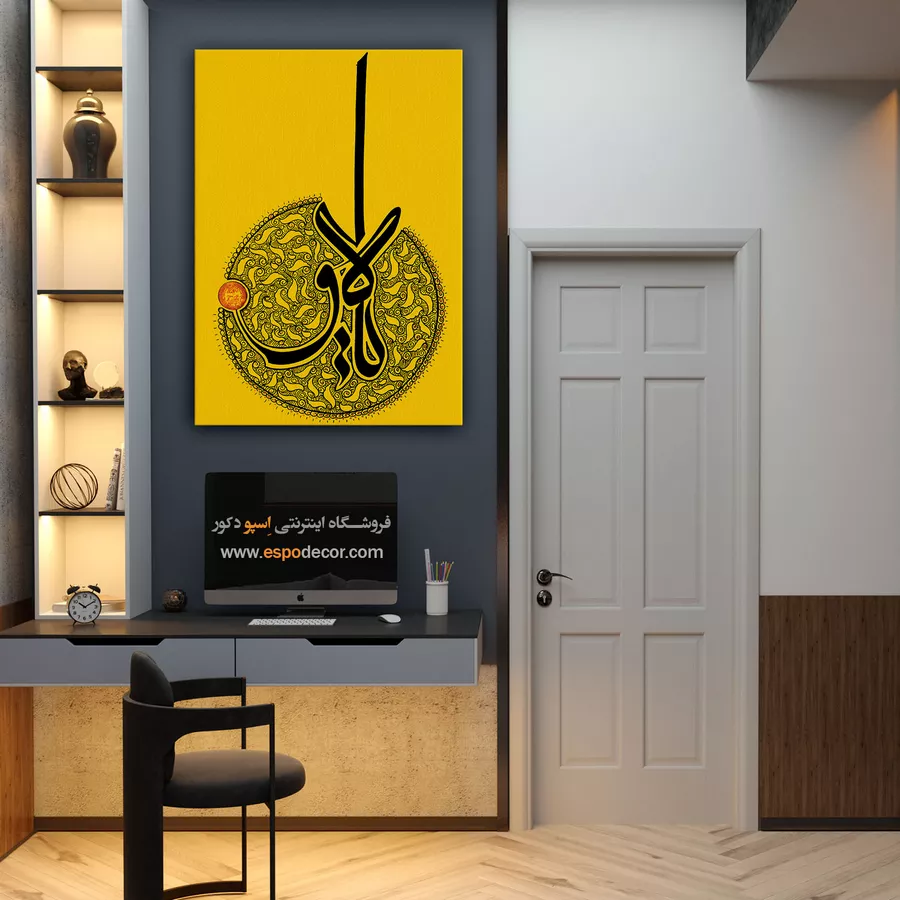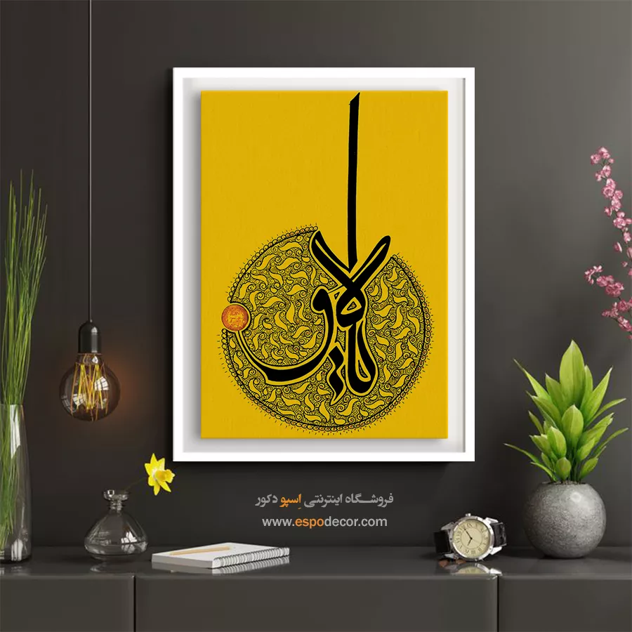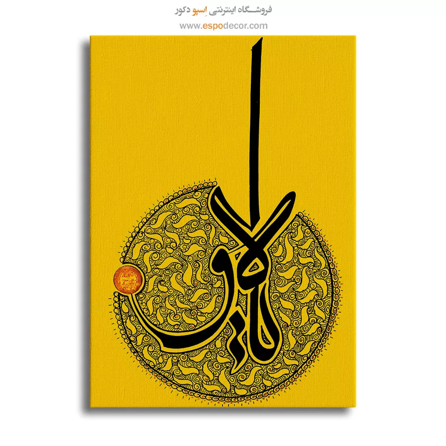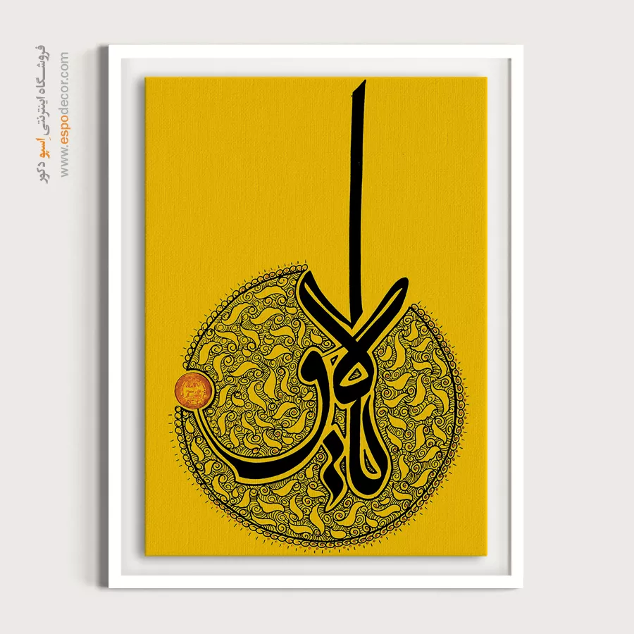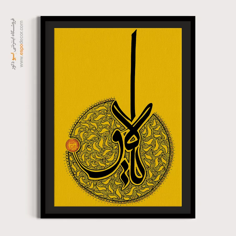 زمینهای زرد و پرقدرت، در کنار خوشنویسی سیاه و مینیمال، اثری مدرن و درخشان را رقم زده است. مرکزیت دایرهای پر از نقوش هندسی و حروفی درهمتنیده، انرژی بیپایان را به تصویر میکشد. این تابلو با سادگی و در عین حال شکوه خطوط، حس معنویت و عظمت را در فضای شما جاری میسازد.