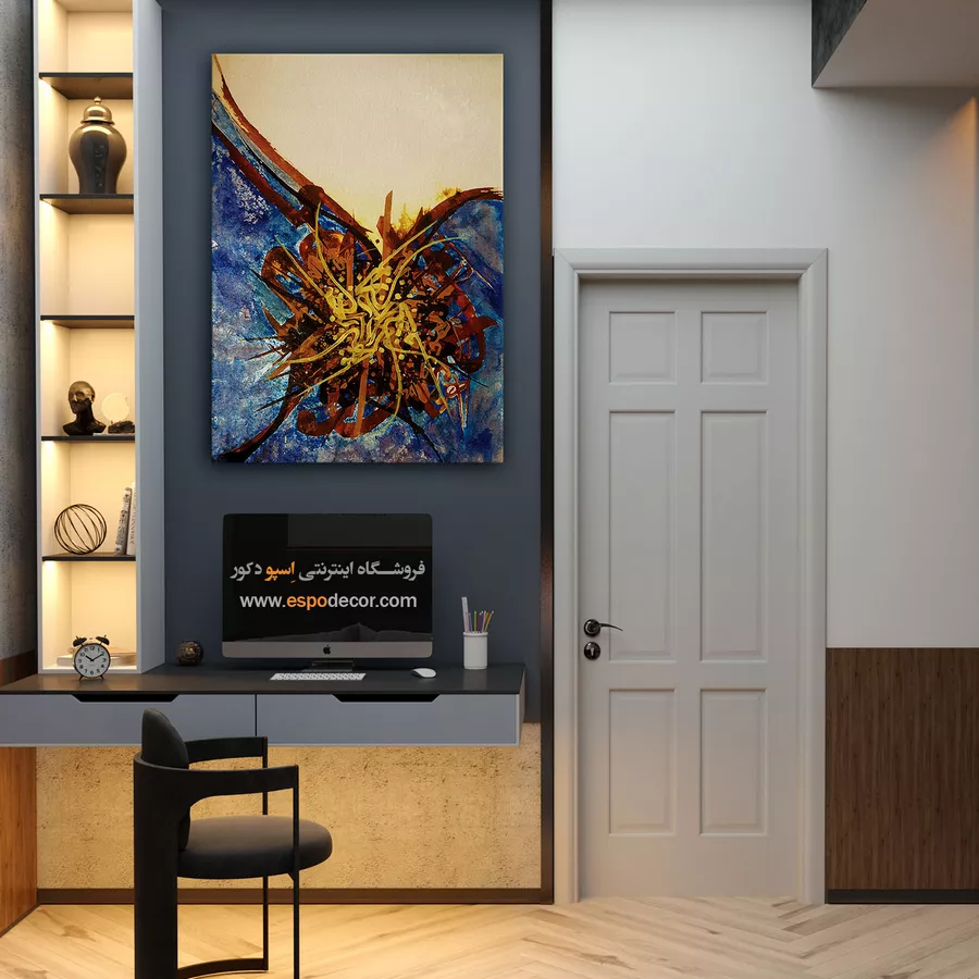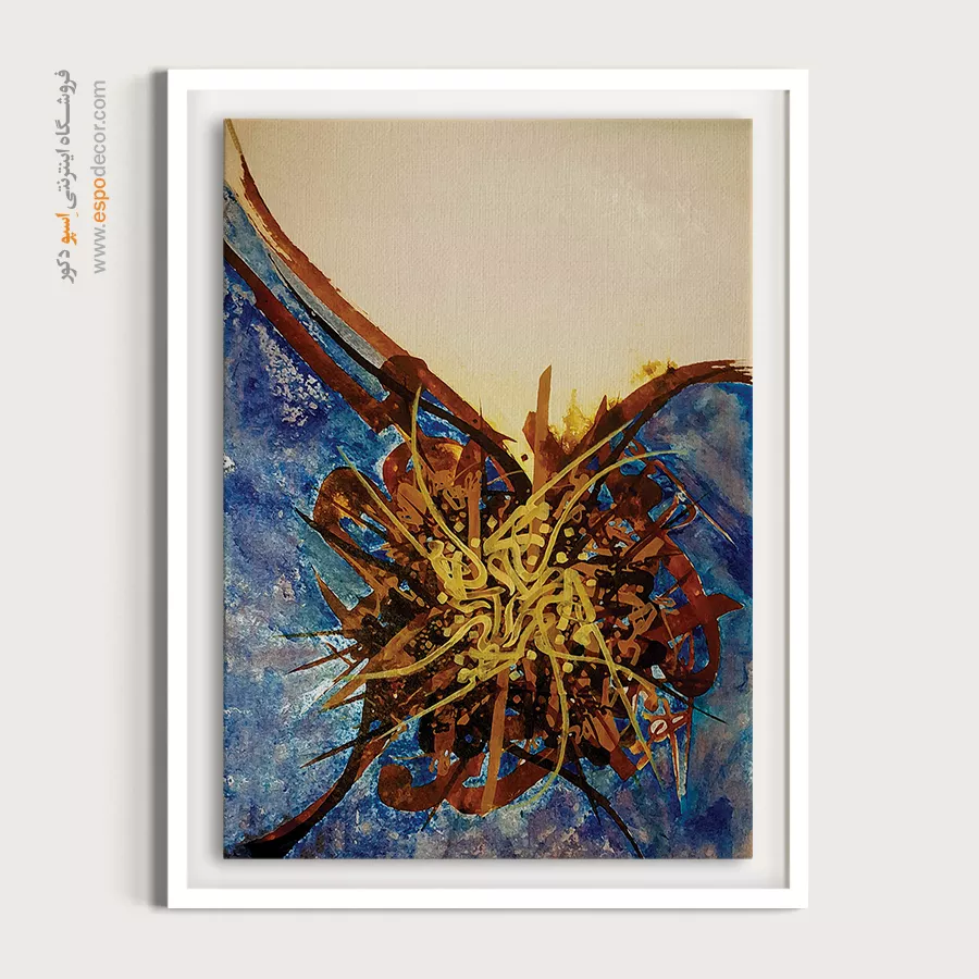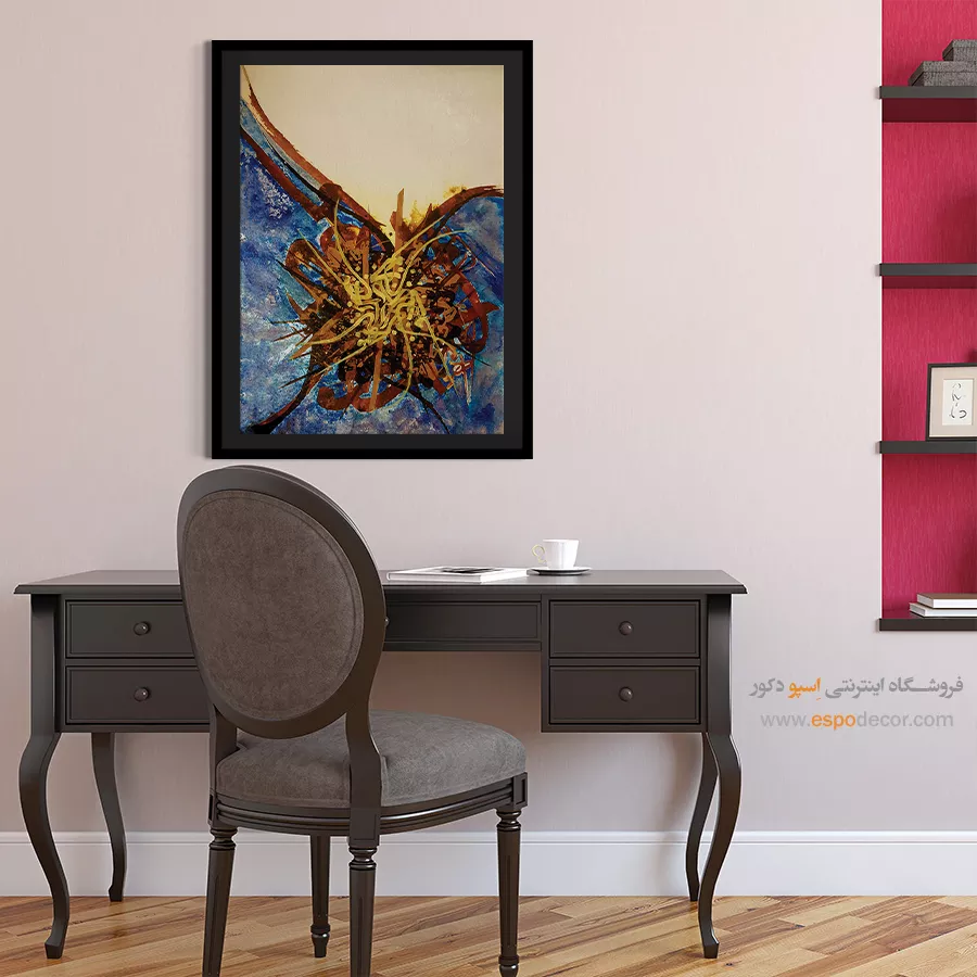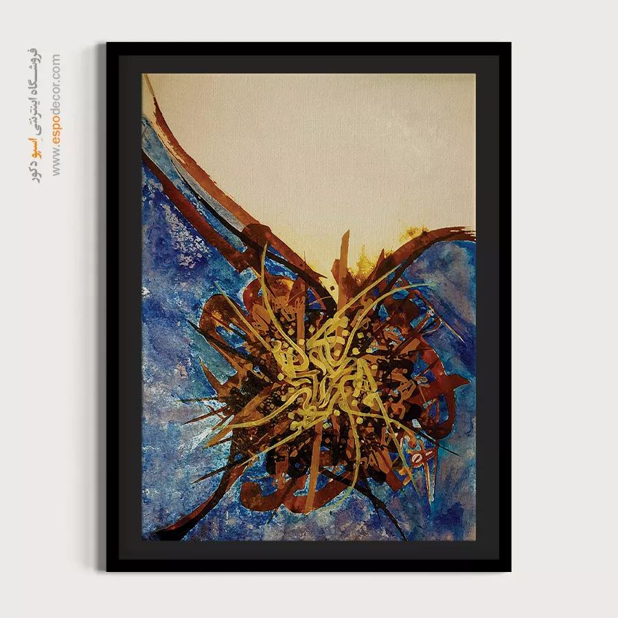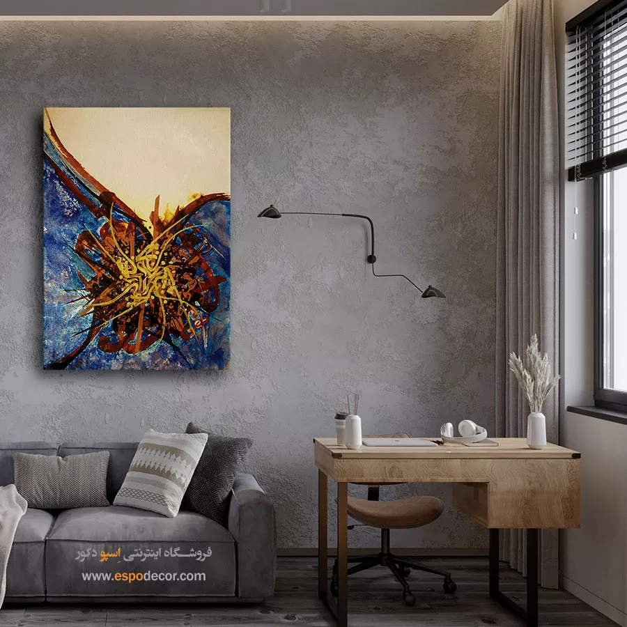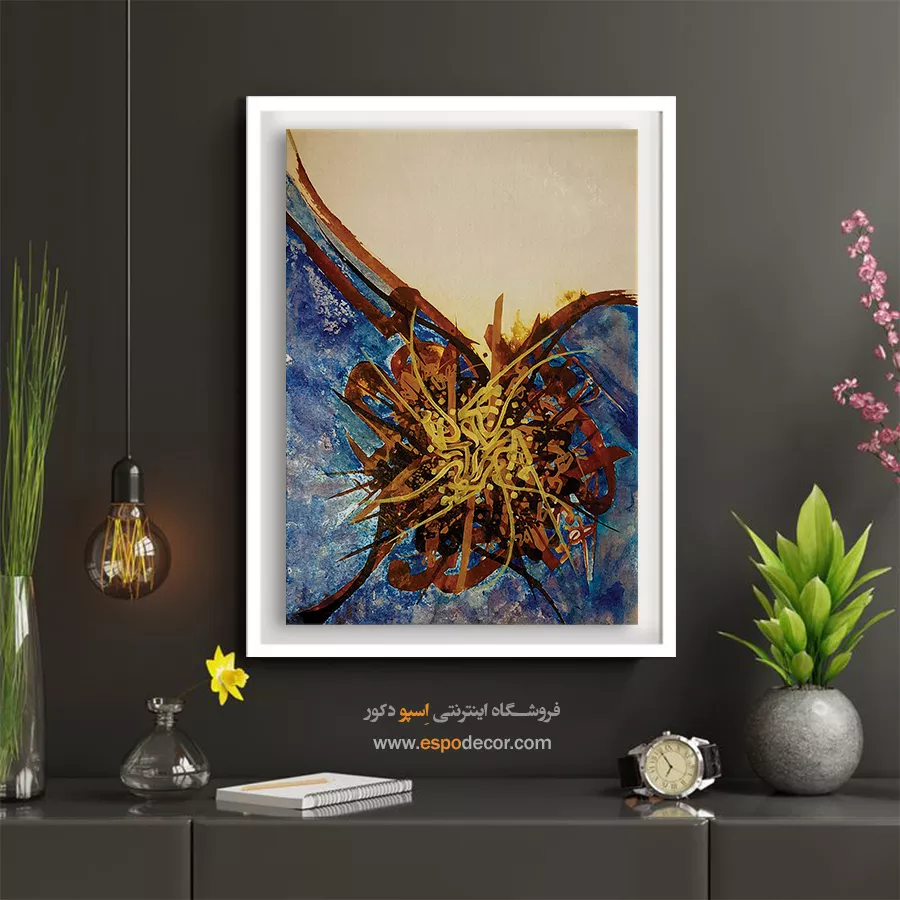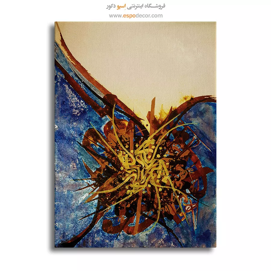 رنگ آبی عمیق در این تابلو نماد آرامش، تفکر و معنویت است، در حالی که طلایی یادآور شکوه، نور و انرژی الهامبخش است. ترکیب این دو رنگ با قهوهای تیره، کنتراستی چشمنواز ایجاد کرده که میتواند به فضا حس تعادل میان آرامش و شکوه ببخشد. این انتخاب رنگی باعث میشود تابلو هم در دکوراسیونهای مدرن و هم کلاسیک جلوهای خاص داشته باشد.