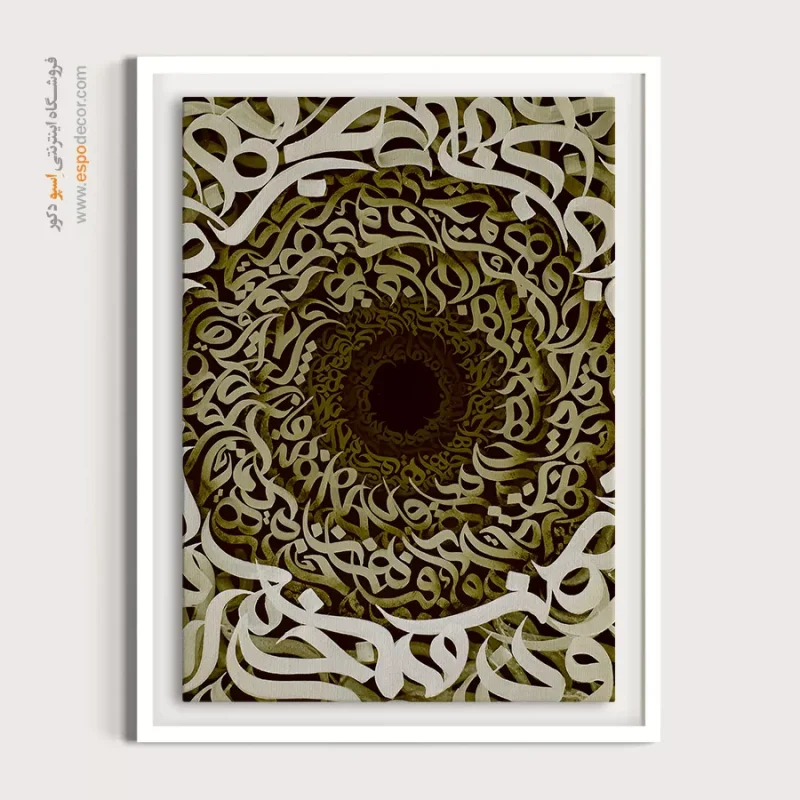 این تابلو با ترکیبی چشمگیر از خطوط نستعلیق و فرمهای چرخشی، حس عمق و جذبهای بیپایان را القا میکند. رنگهای تیره و ملایم با مرکزیتی خالی، فضایی رازآلود و شاعرانه میآفرینند. اثری که نگاه را به درون میکشد و آرامش و تفکر را در دل هر فضایی جاری میسازد.