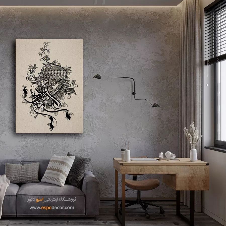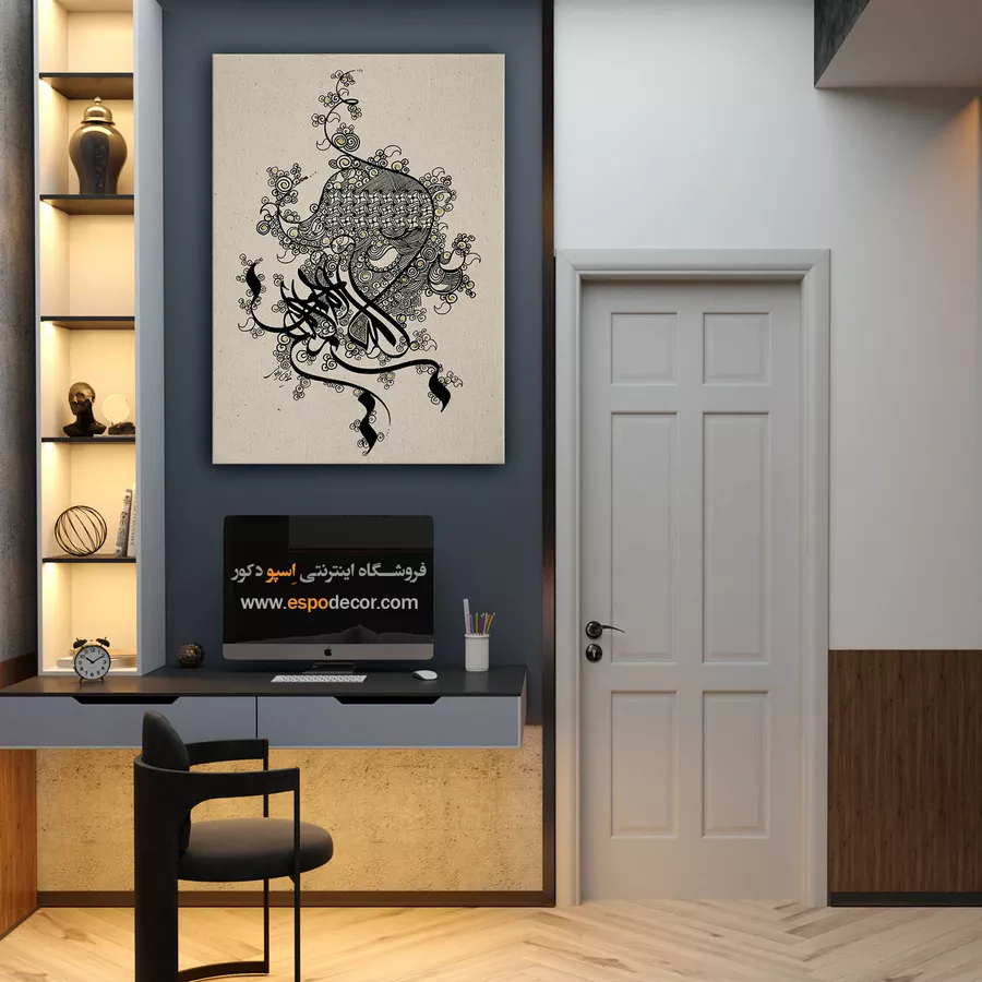 رنگ مشکی و خطوط ظریف خوشنویسی، جلوهای کلاسیک و در عین حال مدرن ایجاد میکند. این طراحی میتواند در فضاهای مینیمال و سنتی، نقطه تمرکز زیبایی باشد و انرژی مثبتی به محیط ببخشد.