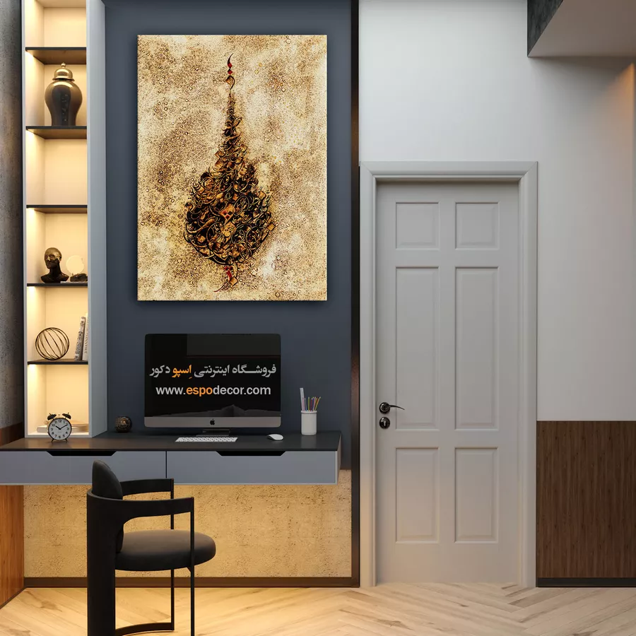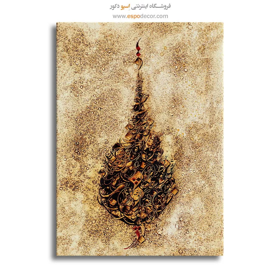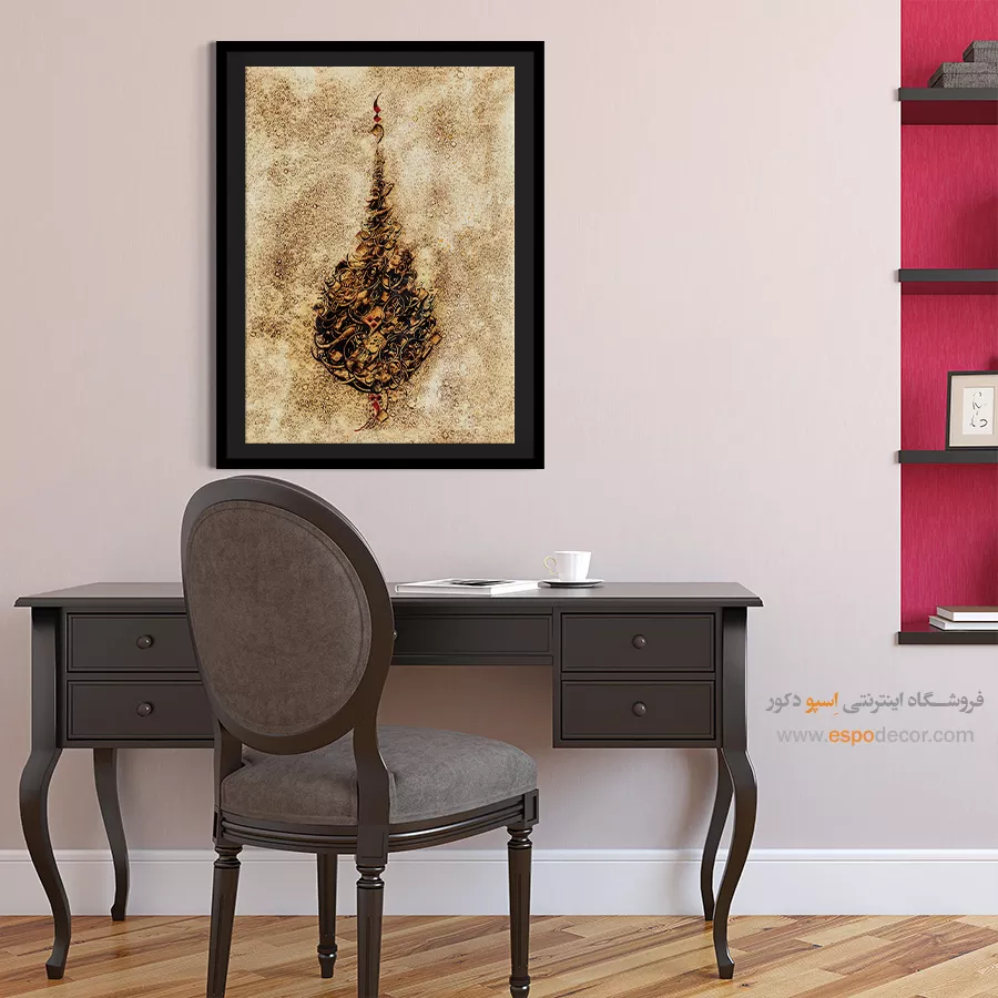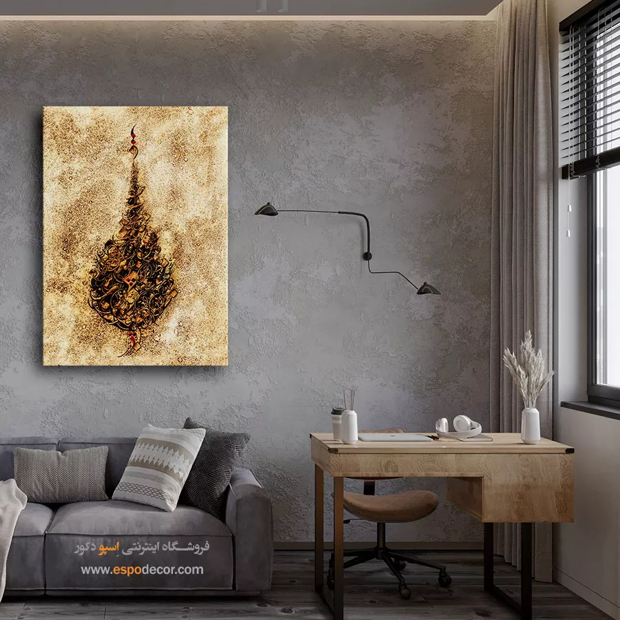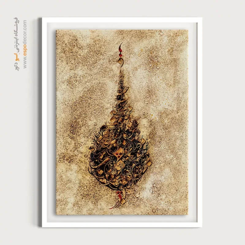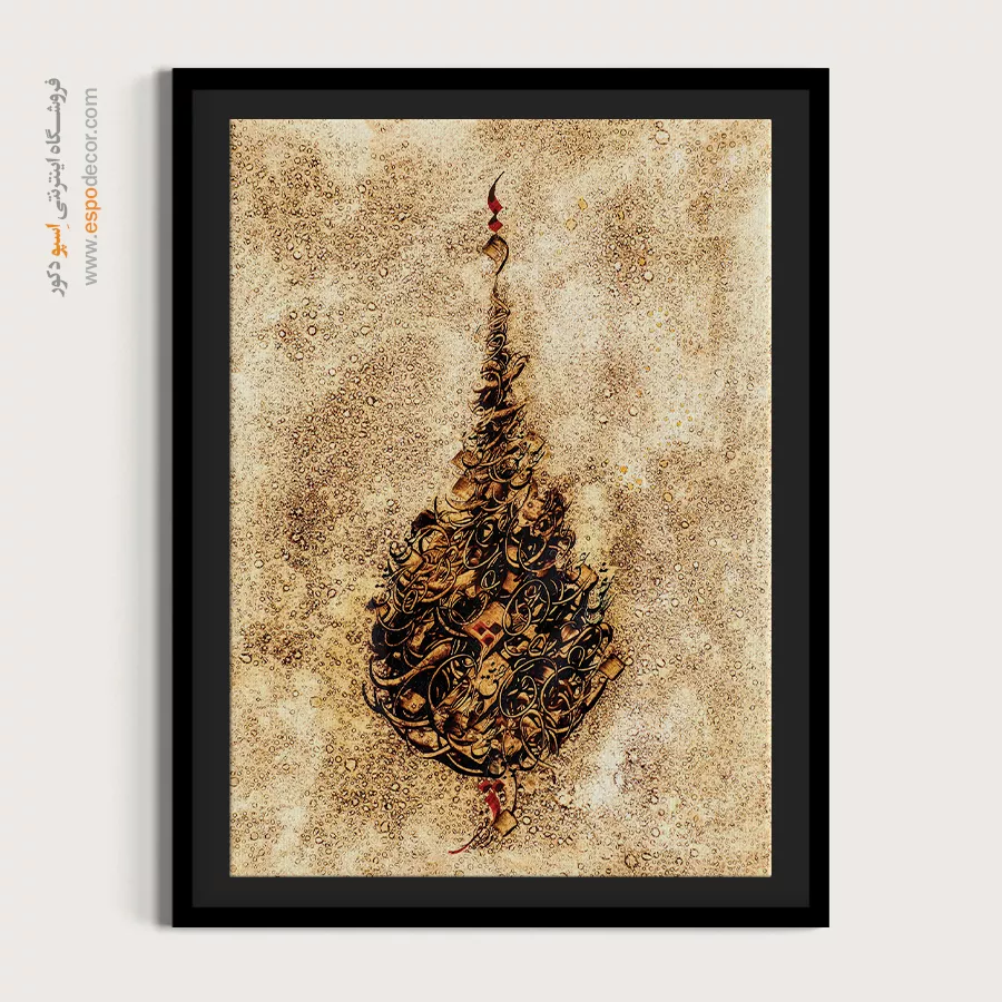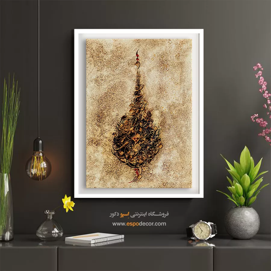 تابلو نقاشیخط «عشق» با طراحی خلاقانه و رنگبندی طلایی ـ قهوهای، جلوهای چشمگیر از هنر اصیل ایرانی را به نمایش میگذارد. ترکیب حروف در قالب فرمی شعلهگون، استعارهای از شور و حرارت عشق است که با پسزمینهای بافتدار و با شکوه، عمق و معنای اثر را دوچندان کرده است.