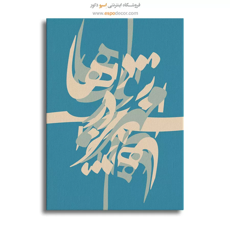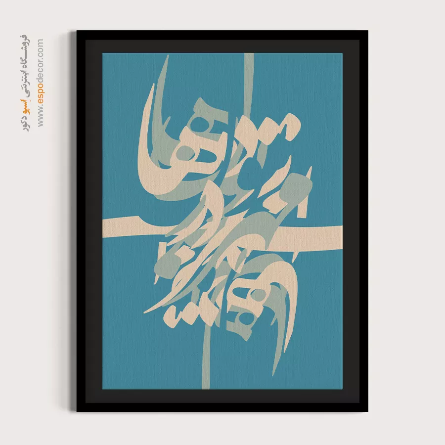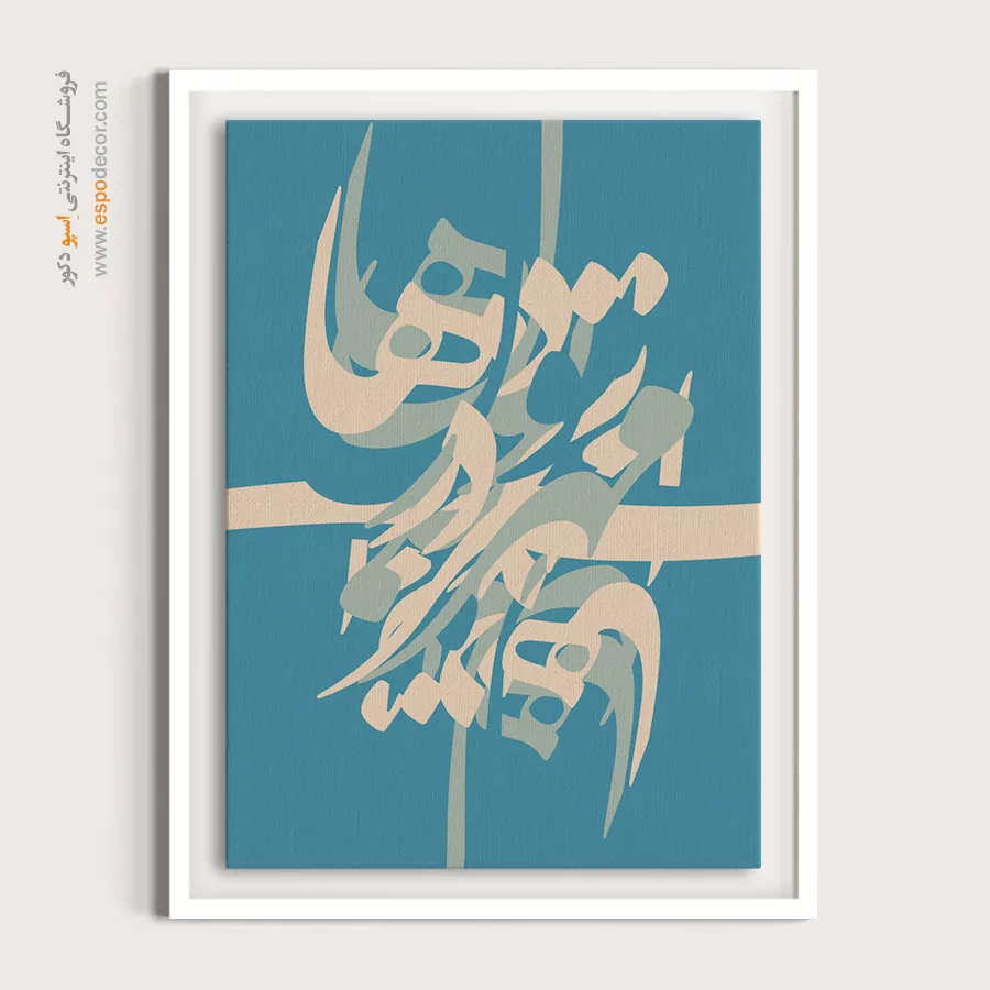 خطوط نرم و درهمتنیده با رنگهای فیروزهای و کرم، حس لطافت و آرامش را در نگاه نخست منتقل میکنند. این اثر جلوهای از مهر و عشق پنهان در دلهاست که در قالب خوشنویسی به شکلی مدرن و انتزاعی بیان شده است. ترکیب رنگهای آرامشبخش، آن را به انتخابی دلنشین برای هر دکوراسیونی بدل میسازد.