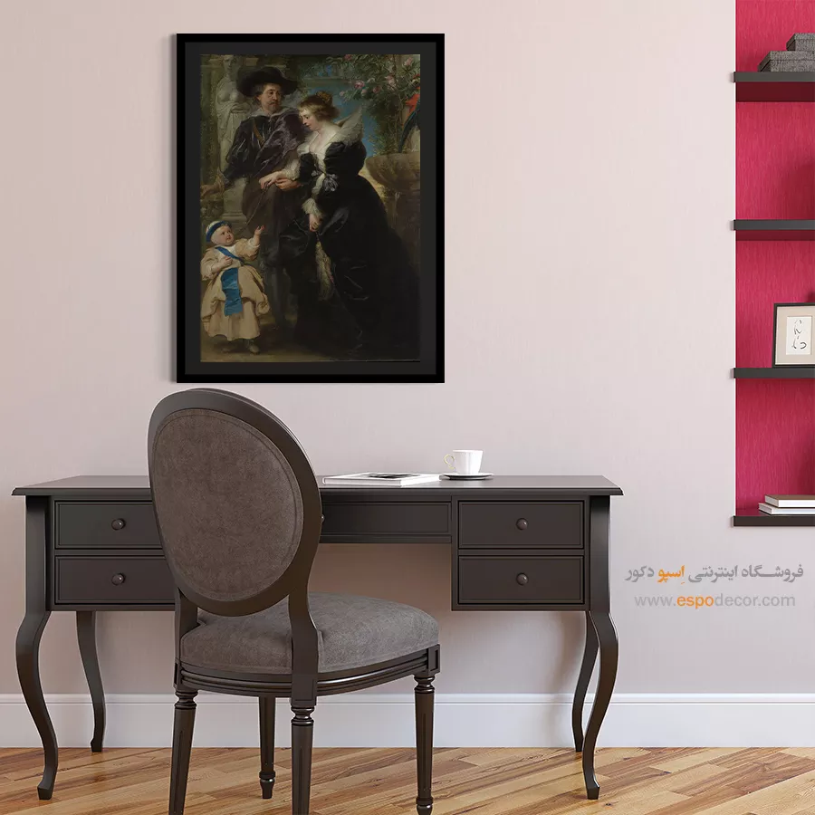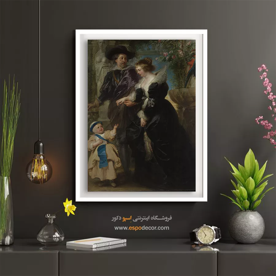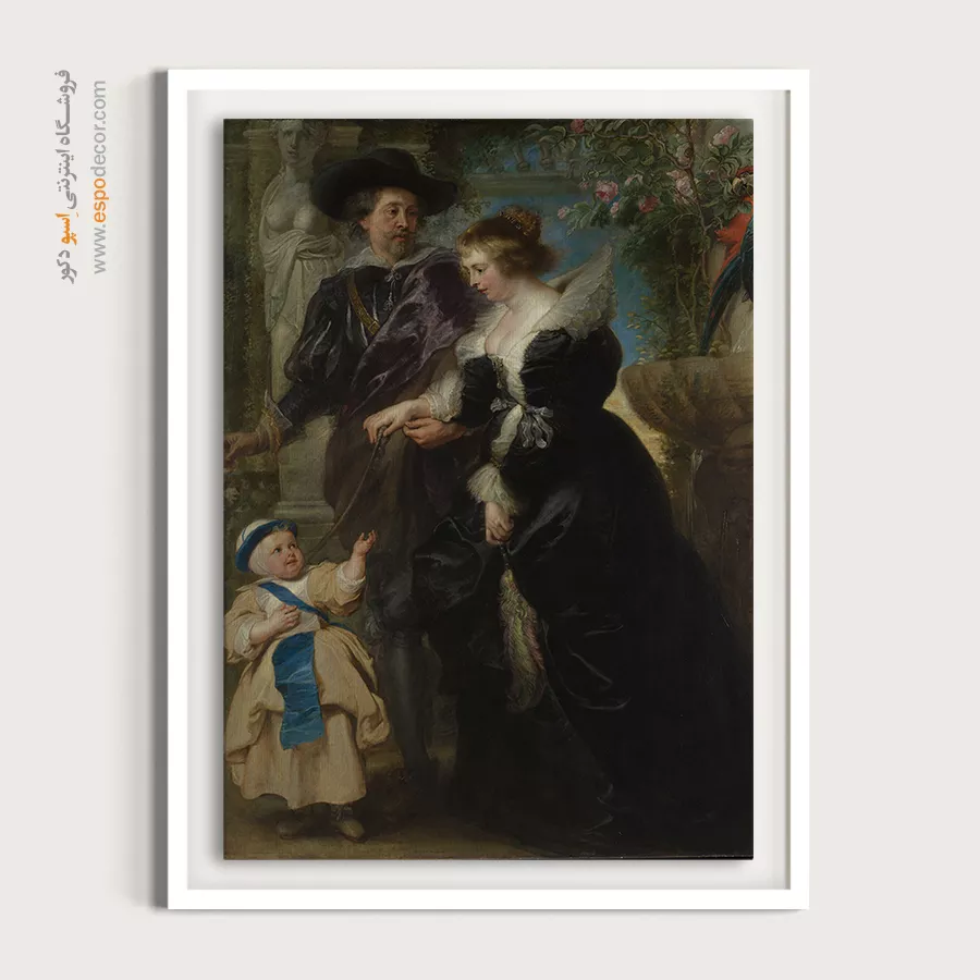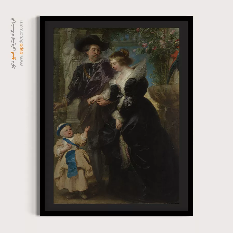 «خانواده روبنس» اثری است که زندگی شخصی هنرمند را به تصویر کشیده است. موضوع اثر، پرترهای خانوادگی است که روبنس، همسر و فرزندش را در باغی آرام نشان میدهد. رنگ غالب مشکی و طلایی همراه با سبزی طبیعت، گرما و صمیمیت را منتقل میکنند. حس کلی اثر آرامش و عشق خانوادگی است. این تابلو برای اتاق نشیمن یا فضاهای هنری بسیار مناسب است. ارزش نمادین آن به عنوان تجسم عشق و پیوند خانوادگی اهمیت ویژهای دارد.