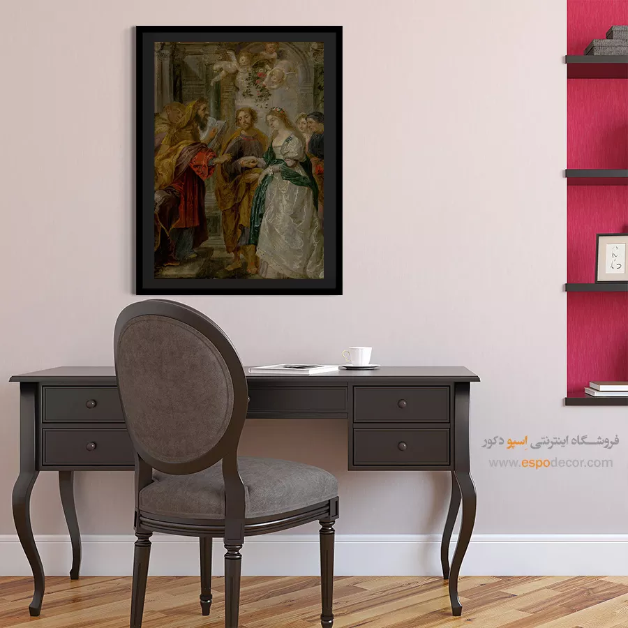این تابلو صحنه ازدواج مقدس را با حضور مریم و یوسف به تصویر میکشد. فرشتگان و رنگهای زنده، فضایی سرشار از تقدس و معنویت آفریدهاند.