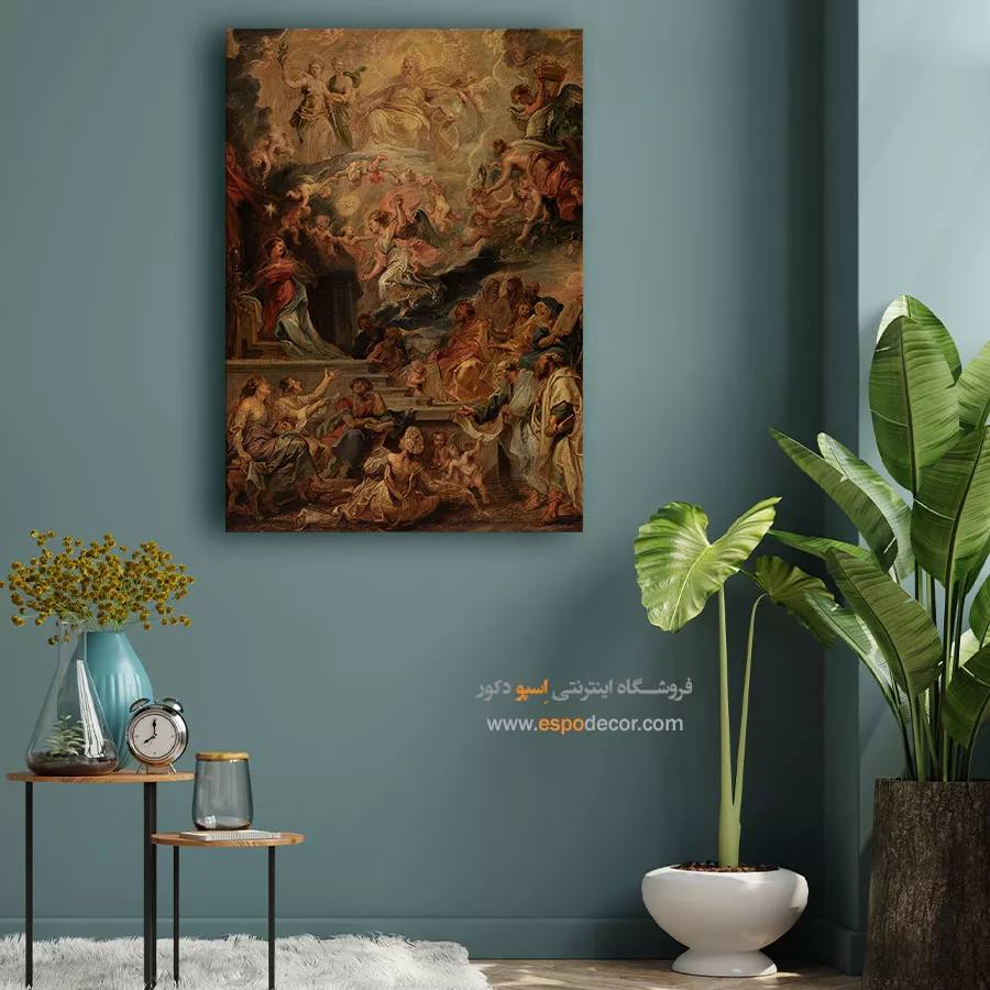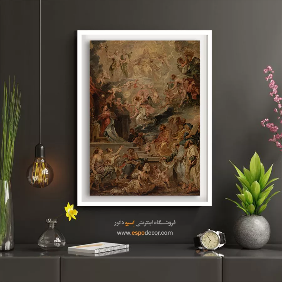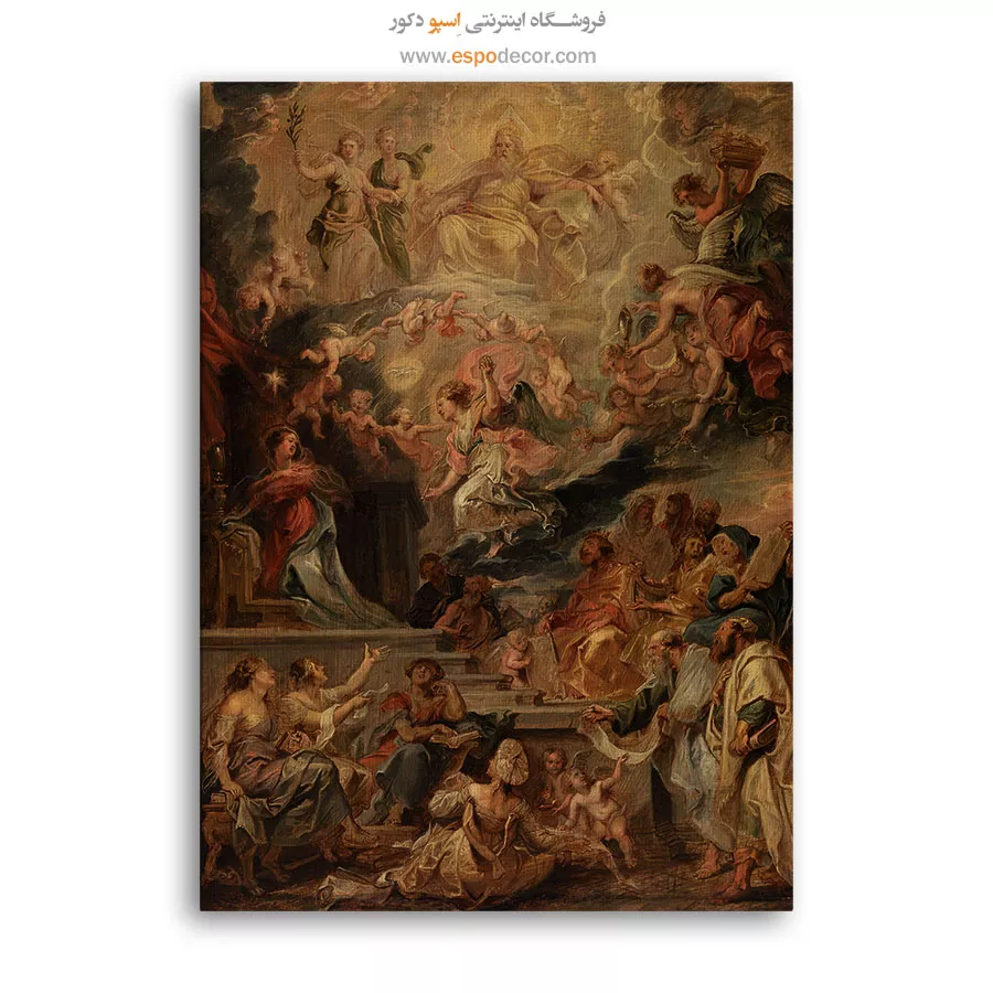 تابلویی باشکوه از آسمان پر از فرشتگان و تجلیات الهی. ترکیب رنگهای روشن و حرکات پیکرهها، حسی از عظمت و شکوه معنوی را پدید آورده است.
